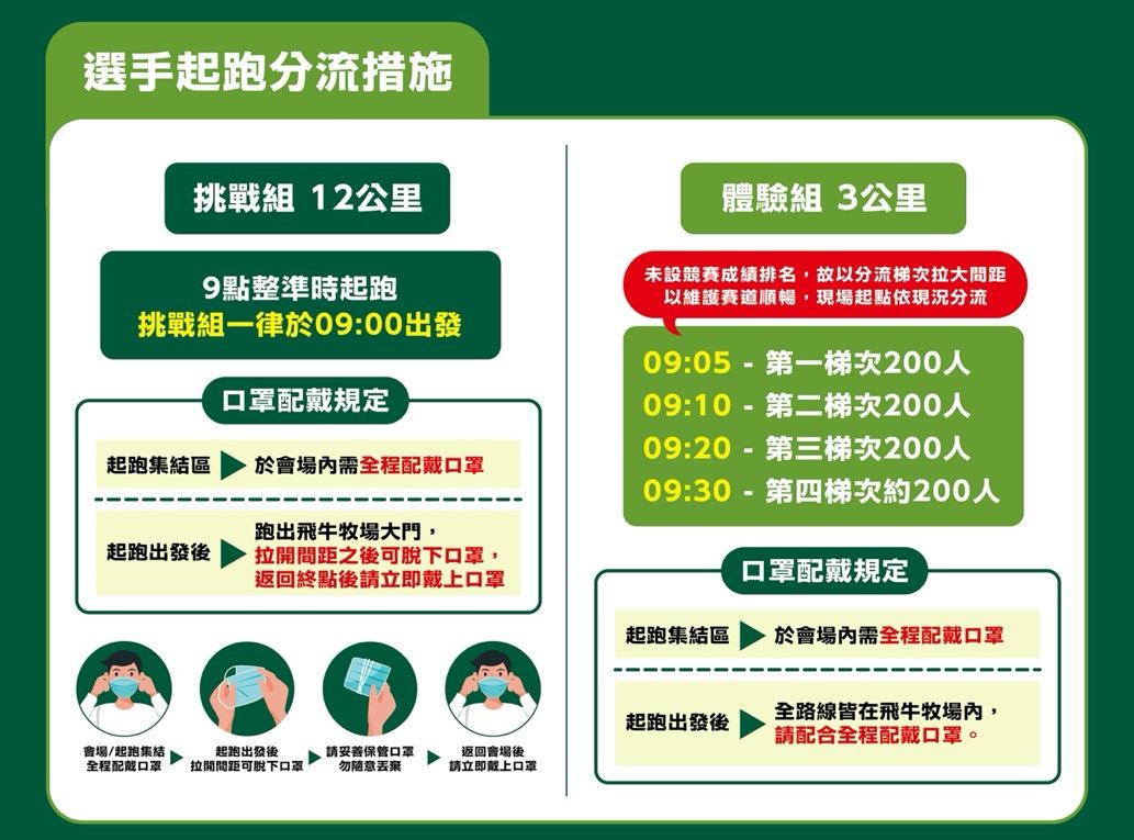 活動現場備有體溫測量站,並設置酒精站,供選手進入活動會場時進行消毒。跑者於起點集結處,須全程配戴口罩,出發後,12公里組選手跑出飛牛牧場大門,拉開間距之後可脫下口罩,回到終點後需立即戴上口罩;3公里組選手因路線皆在飛牛牧場內,必須全程配戴口罩,現場另有配置備用口罩供跑友使用;補給站的補給品則採單包裝,會場活動攤位禁止販賣現場製作食品,並禁止民眾邊走邊吃,以確保成員及選手健康安全為最優先考量。