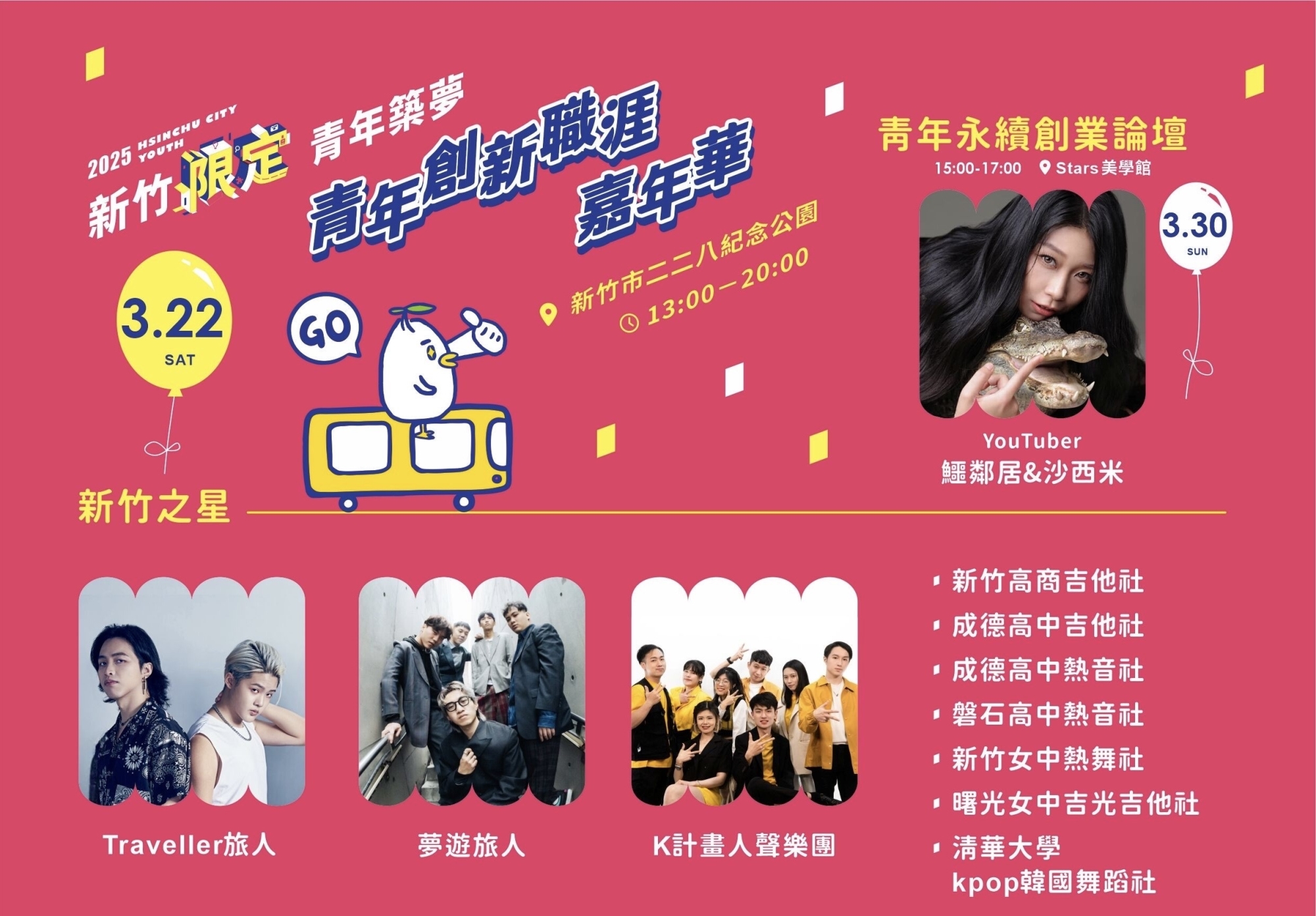 專屬青年朋友的「新竹市青年創新職涯嘉年華」將於22日(六)下午1點至晚上8點,在新竹市228紀念公園登場!