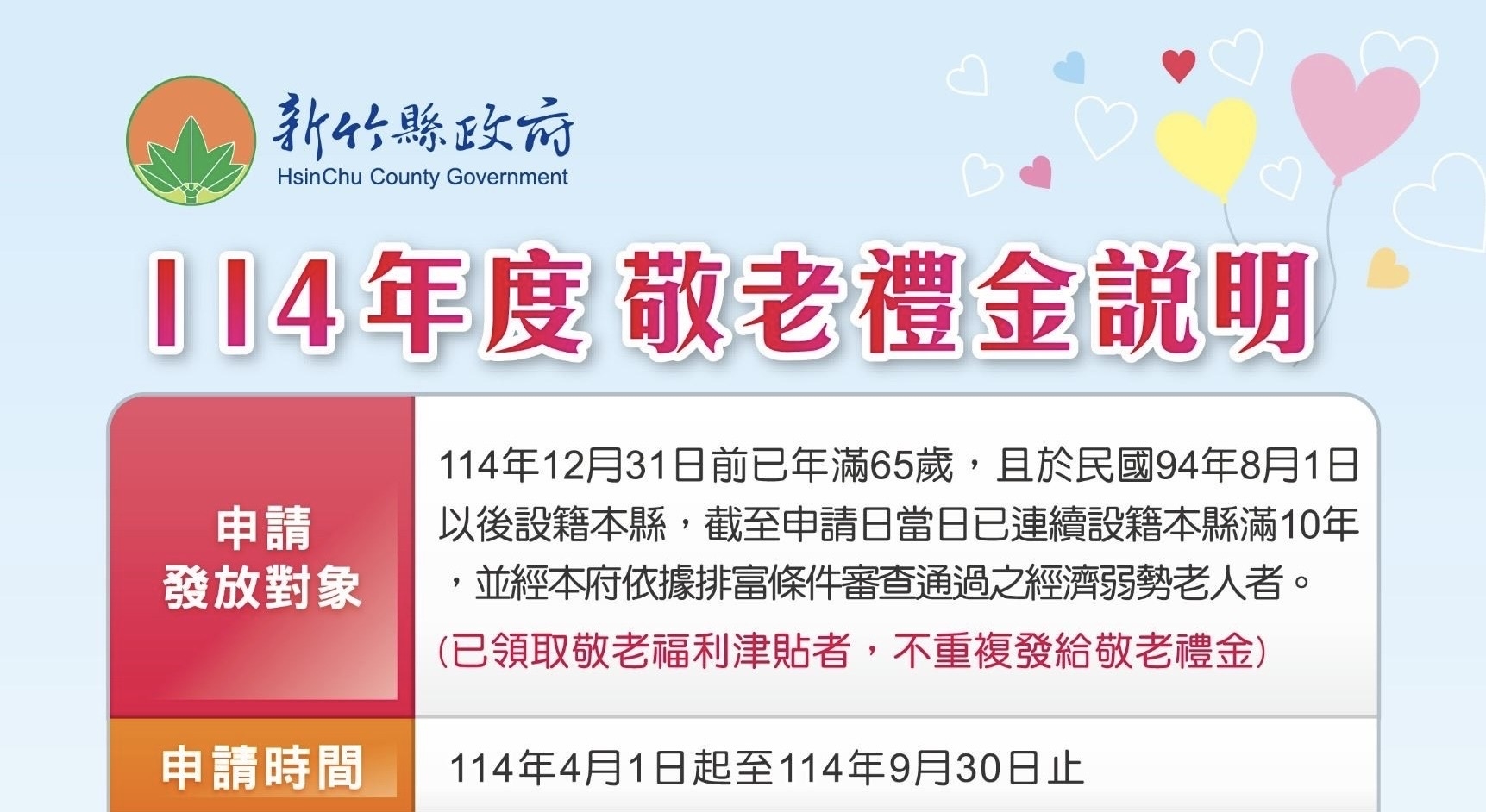 竹縣今年續發敬老禮金一萬元,自4月1日起到9月3 0日止受理申請。符合資格的長輩們收到通知後,備妥相關資料至戶籍地所在的鄉(鎮、市)公所申請。