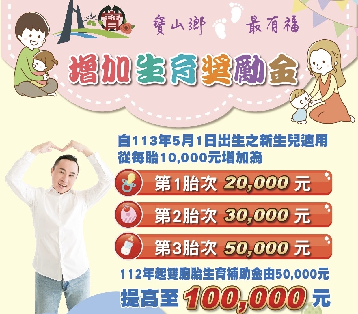 為優化社會福利政策,去年5月起生育獎勵金由每胎1萬元,增加為第一胎2萬元、第二胎3萬元、第三胎以上每胎5萬元,將「雙胞胎」生育補助金從5萬元一口氣提升至10萬元。以減輕年輕爸媽工作及經濟上壓力,讓大家敢生、能養,藉此提高寶山鄉生育率。