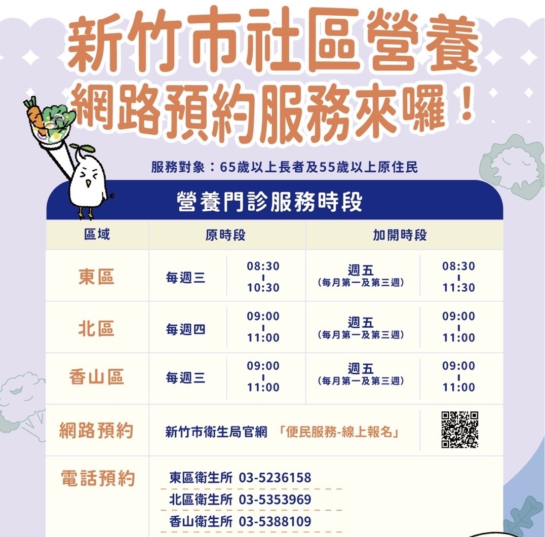 竹市政府為讓長者更便利地獲得營養諮詢服務,即日起擴大竹市社區營養推廣中心的營養門診服務,並首度啟用線上預約平台。