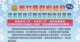 自109年起竹縣府攜手公益團體,推動「微型團體傷害保險」,針對15至75歲符合資格的縣民,提供免費意外傷害保障,最高理賠金額可達30萬元。