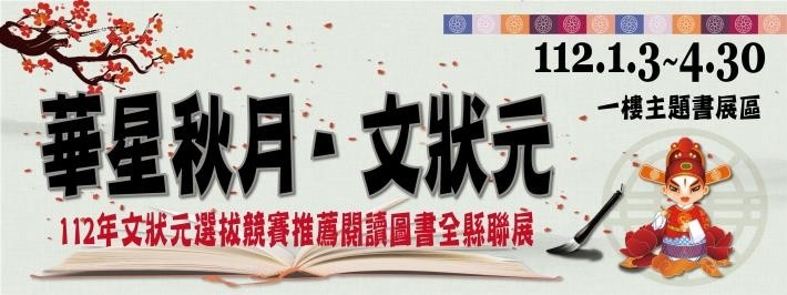 「華星秋月.文狀元」苗栗縣112年文狀元選拔競賽推薦閱讀圖書全縣聯展登場了!苗栗縣立圖書館、各鄉鎮市立圖書館、各國中小圖書館(室)及社區共讀站等含國立、私立高中附設國中部,於112年1月3日至4月30日,展出國小10本、國中8本之文狀元選拔競賽推薦閱讀書籍,供予師生與鄉親閱覽。