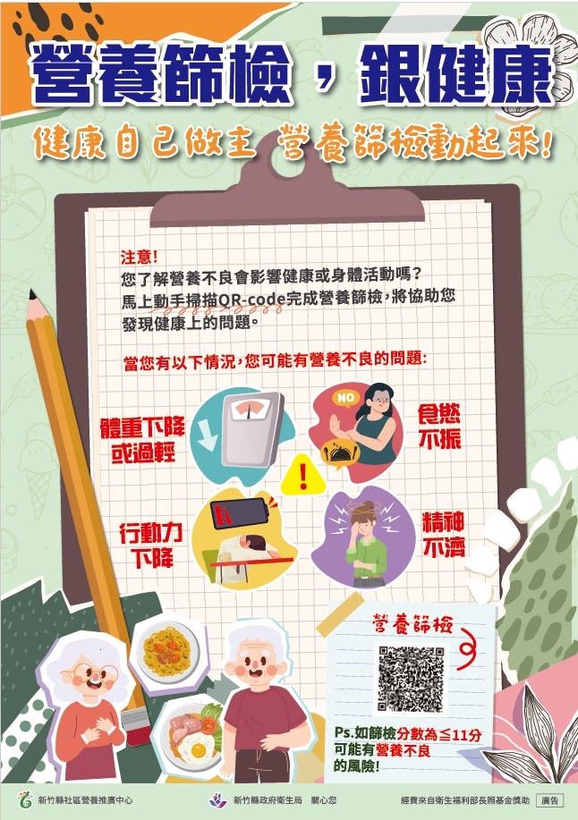 高齡長者為容易發生營養不良的潛在族群,若不注意可能發生衰弱或肌少症,為預防潛在危險,新竹縣政府衛生局舉辦「健康自己做主 營養篩檢動起來」活動,鼓勵長者及親友利用簡單又方便的迷你營養評估量表短版(MNA-SF),快速掌握自己的健康狀況,鼓勵社區據點長者一起參與,優先評選出的前30個據點,即可獲得蔬菜箱。