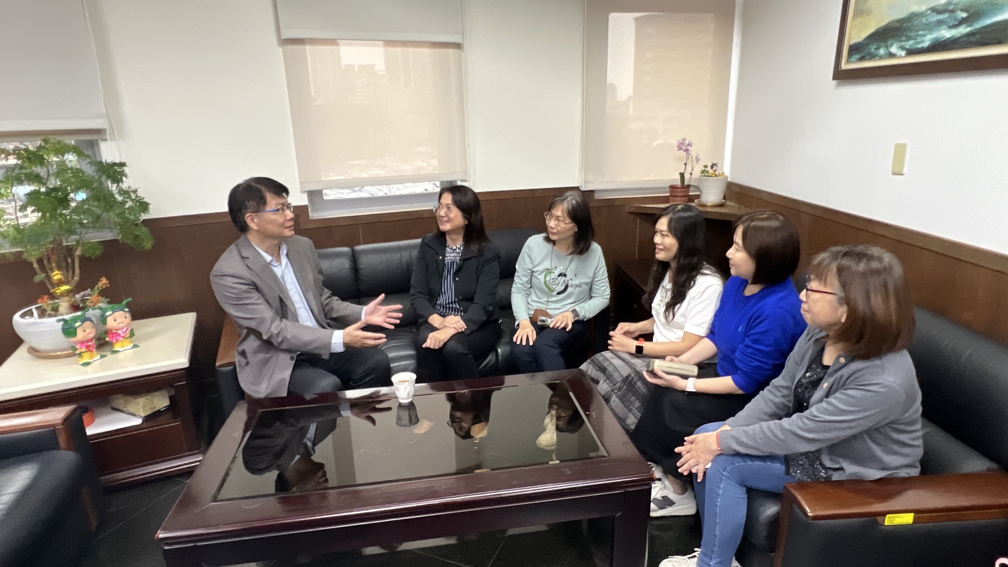 俞必勤(左二)帶領團隊和彭柏硯(左)愉快商議優勢目標 何高祿攝