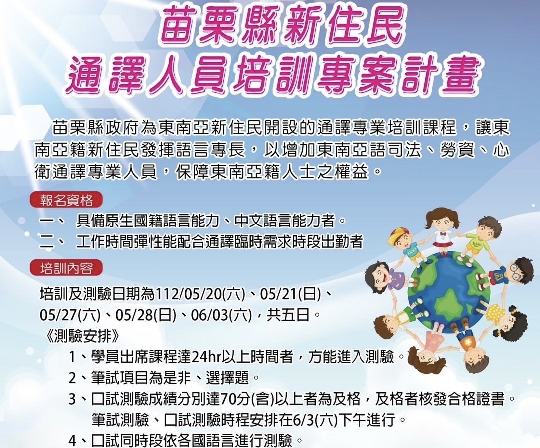 苗縣新住民家庭服務中心,於5月20日、21日、27日、28日、06月03日,共30小時辦理「苗縣新住民通譯人員培訓專案計畫」,歡迎具備原生國籍語言能力,並具備中文語言能力至少符合檢定基礎與基礎行政和文書處理能力新住民參訓,藉由培訓強化輔導通譯人員通譯技巧及專業知能,以提升通譯服務使用效益,保障在苗縣外籍人士權益。