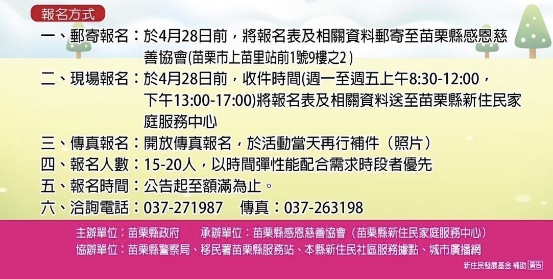 現場報名4月28日前,在收件時間(週一至週五上午8:30-12:00,下午13:00-17:00)將報名表及相關資料送至苗栗縣新住民家庭服務中心(苗栗市上苗里站前1號9樓之2 )。傳真報名於活動當天再行補件(照片)。