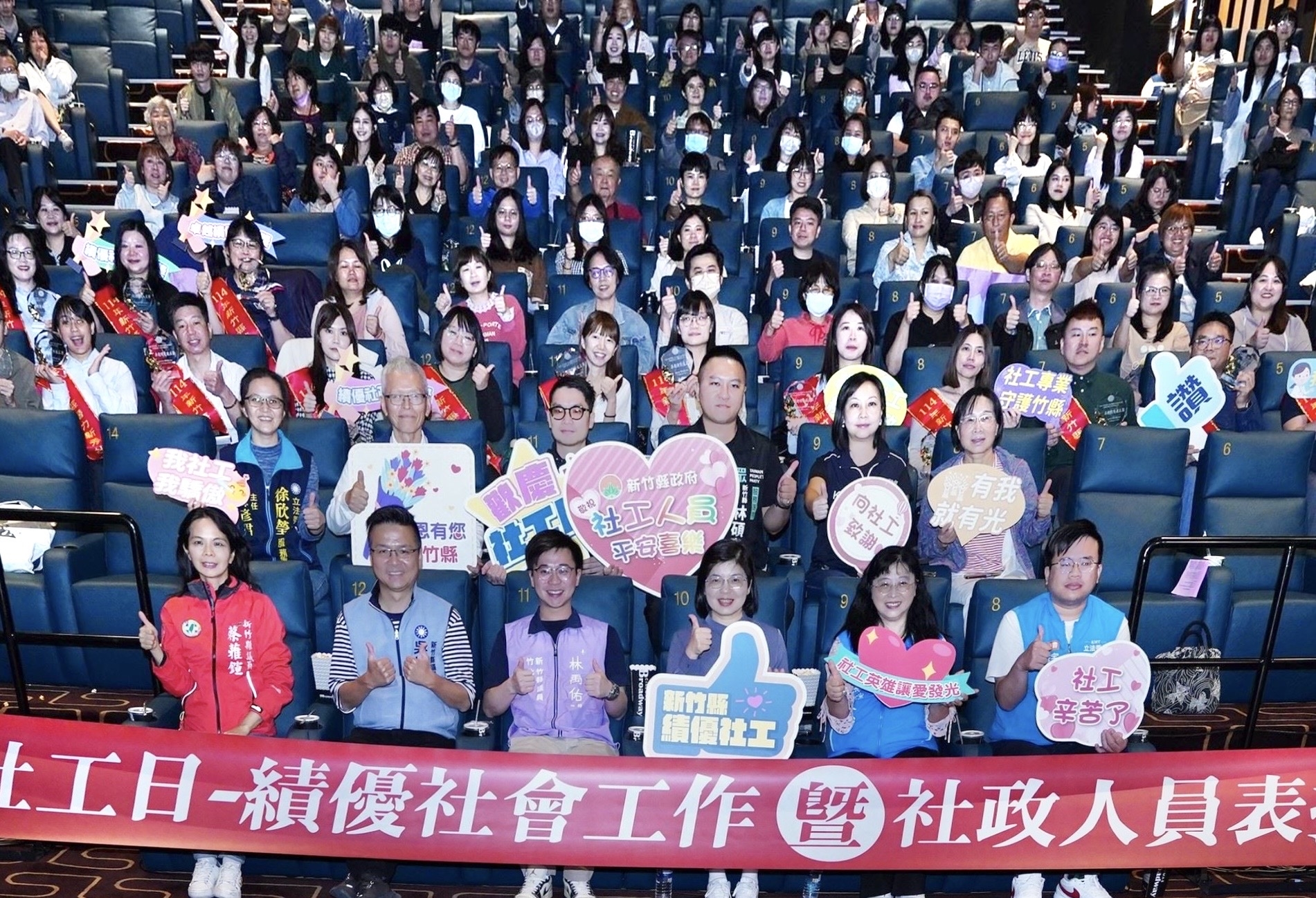 為表彰在社福領域中表現傑出的社工人員及社政人員,新竹縣政府每年舉辦表揚活動,今(27日)首次在享平方百老匯影城舉辦「114年度新竹縣社工日-績優社會工作暨社政人員表揚典禮」,由秘書長李安妤代表縣長楊文科頒發獎座及住宿券給予15位績優人員,同時一起在電影院欣賞獲獎者分享工作心路歷程影片及國片《夜校女生》,感謝他們為社會的卓越貢獻。