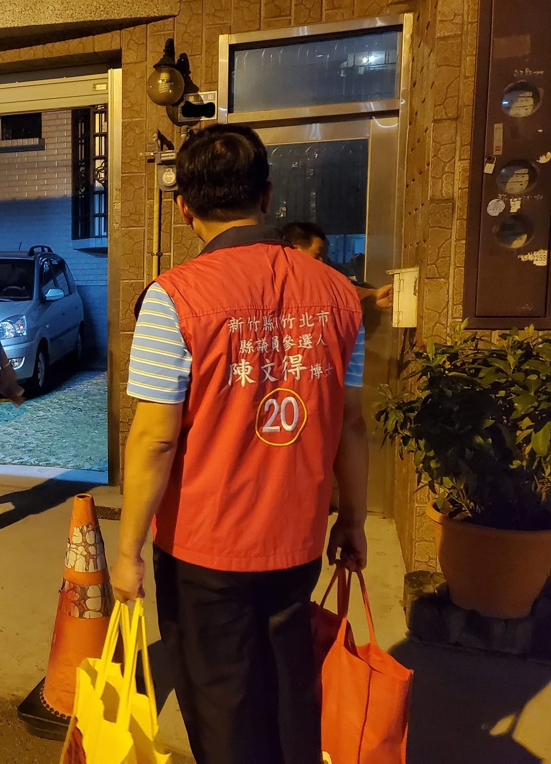 夜晚仍在鄰里間奔走的 竹北選區縣議員候選人20號陳文得(阿北) 何高祿 攝
