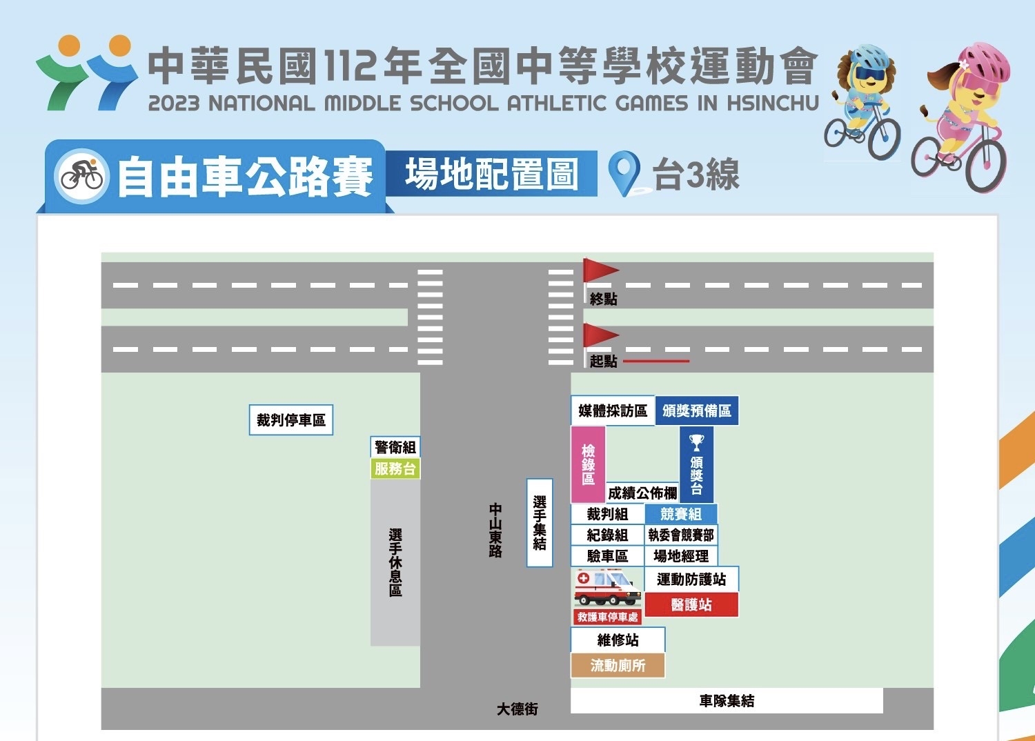 112年全國中等學校運動會自由車公路計時賽、公路賽即將分別於4月20日、21日登場,計時賽於新竹縣台61線西濱快速道路高架道路舉行,公路賽則在新竹縣台3線舉辦,因場佈與賽事進行,將分別實施路段管制措施,敬請用路人配合改道,經台3線若遇上選手,請多加注意選手與自身安全。