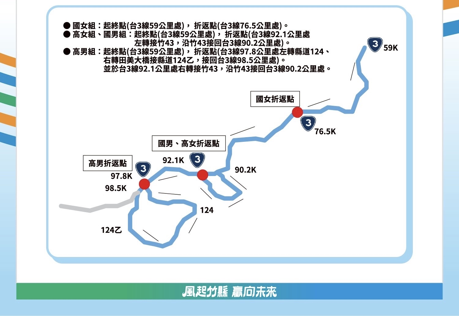 二、高女組、國男組:起終點(台3線59公里處),折返點(台3線92.1公里處,左轉接竹43,沿竹43接回台3線89.5公里處)。