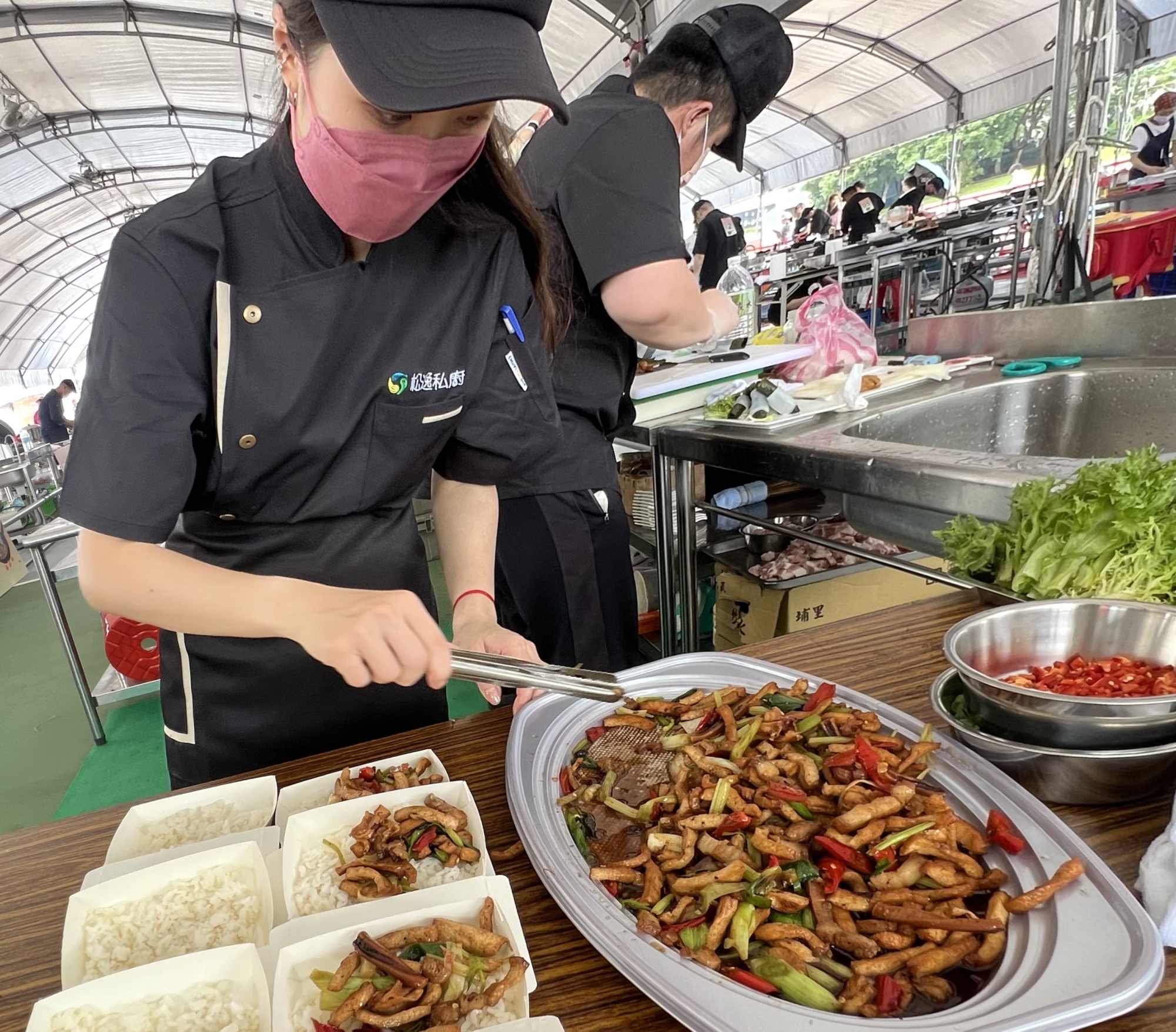 2023客家小炒全國爭霸賽,北區擂台3日上午十時半在龍潭運動公園登場,陣陣大雨沒有降低小炒競爭火力,來自北市、新北、桃園、新竹縣市30隊,包含在地人氣餐館、複合式經營餐廳、特色私廚和星級飯店加入競賽。