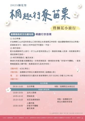 每年4月至5月是油桐花盛開時節,除苗栗桐花祭活動外,今年縣府結合了苗栗市、三義鄉、造橋鄉、銅鑼鄉及南庄鄉公所5個鄉鎮市公所,即日起至5月11日推出賞桐系列活動。
