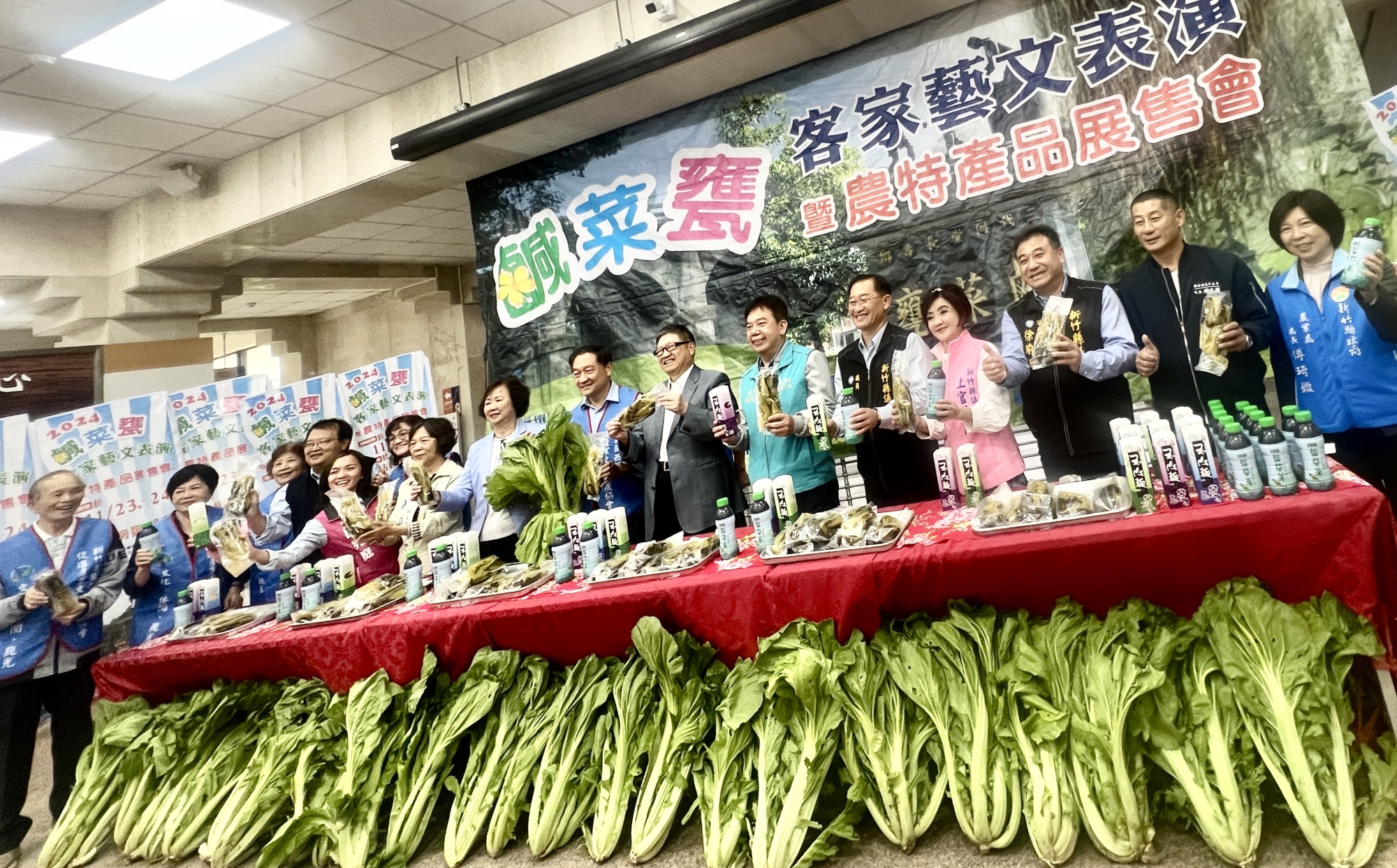 「2024鹹菜甕客家藝文表演暨農特產品展售會」新竹縣關西鎮年度盛事,23、24日於關西東安古橋旁臨時停車場熱鬧登場,今(18日)新竹縣長楊文科、關西鎮長陳光彩、關西鎮促進產業文化發展協會榮譽理事長劉文禎等人,由資深關西在地議員徐瑜新執麥克風熱場,於竹縣府大廳共同造勢宣傳,攜手推廣關西鎮鹹菜甕及地方風光秀麗,歡迎遊客到關西來趟輕旅行,欣賞古早傳統技藝及客家自然風情。
