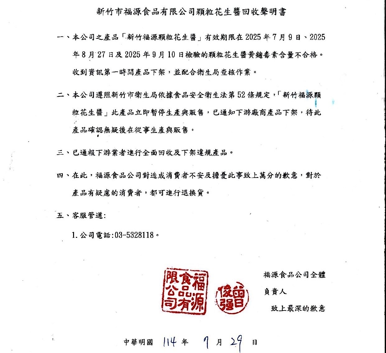 名揚海內外的新竹市福源花生醬,以生產多樣化花生產品受消費者肯定喜好。產品中顆粒花生醬檢出黃麴毒素不合格,引起消費者驚訝。今(29)日竹市福源花生醬誠懇認錯,書面向社會大眾道歉。