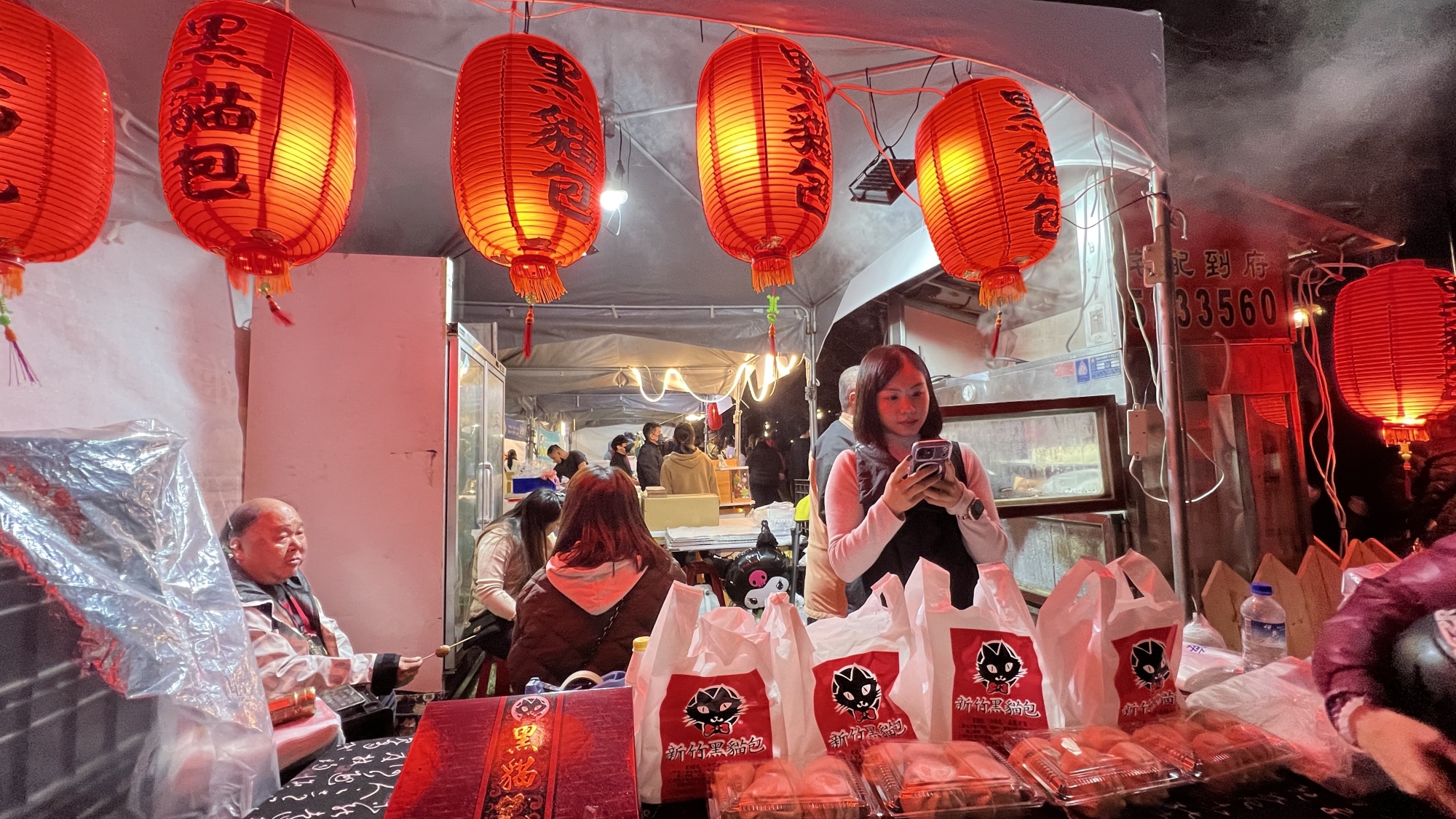 會場熱鬧攤販如超級趕集夜市,燈火通明,在人群鼎沸熱情中,生意川流不息,新竹黑貓包掌門蘇守雄和海瑞貢丸董娘陳奕璇,親自在跨年市集督陣,歡聚迎接新年光輝運勢。
