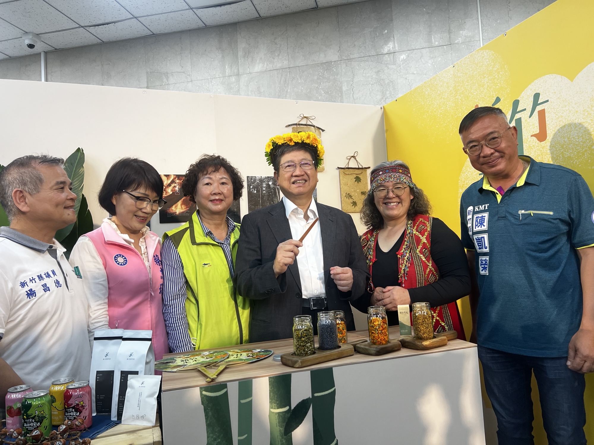 縣長楊文科今(8)日在縣府大廳舉辦的記者會中搶先體驗尖石風情,頭戴尖石那羅部落金盞花編成的頭環,用桂花、薰衣草、金盞花等香草,調配香草茶,楊縣長並和與會的民意代表共同啟動從濱海一路旅讀到山林的循味巴士,邀請全國民眾共襄盛舉。