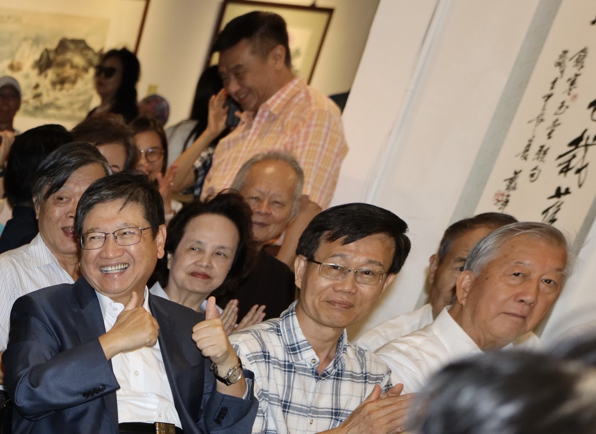 前新竹縣長邱鏡淳(右)難得出現在藝術展場 何高祿攝