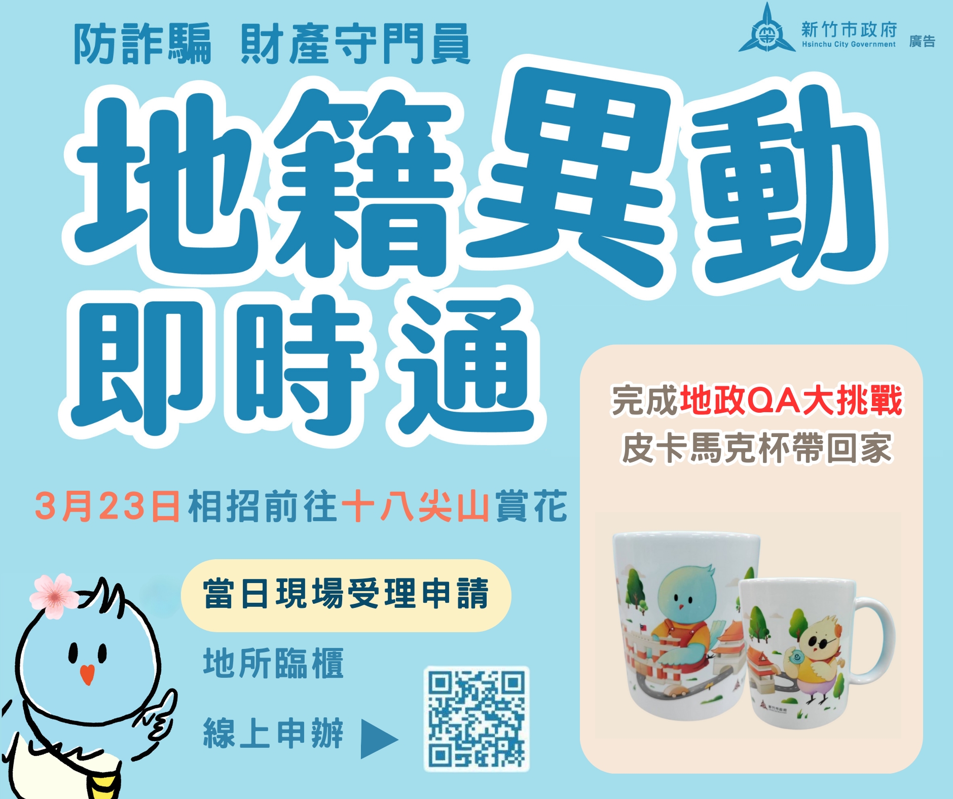 竹市政府地政處與新竹市地政事務所,在春暖花開之際,23日(日)上午9點至12點,於「十八尖山賞花季」與「風城GOGO健康夠夠健走活動」現場設立地政專業諮詢及便民服務攤位,讓市民在欣賞美景的同時,亦能享受到便捷的地政服務。