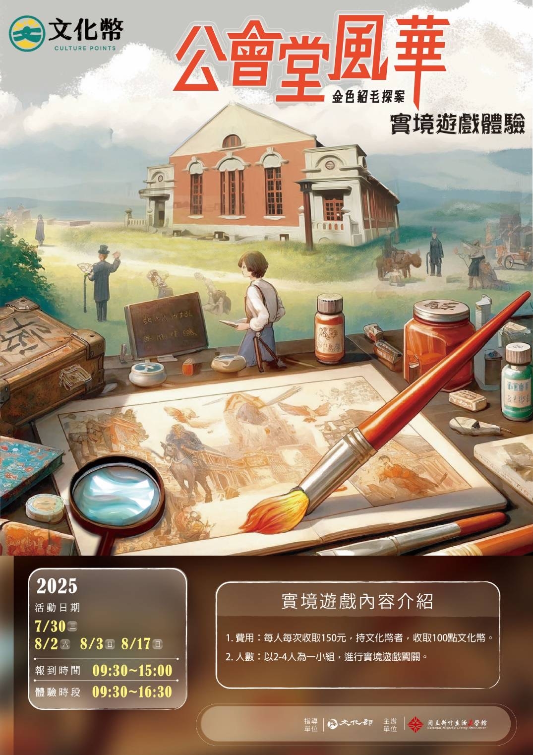 公會堂風華:金色貂毛探案」實境遊戲活動,2日(六)、3日(日)、17日(日)每天各辦理1場全天體驗活動,每場次限定人數50人,只需100點文化幣或現金體驗價150元即可報名。遊戲巧妙結合歷史建築探索與實境解謎,邀請您身歷其境,感受公會堂的獨特魅力。