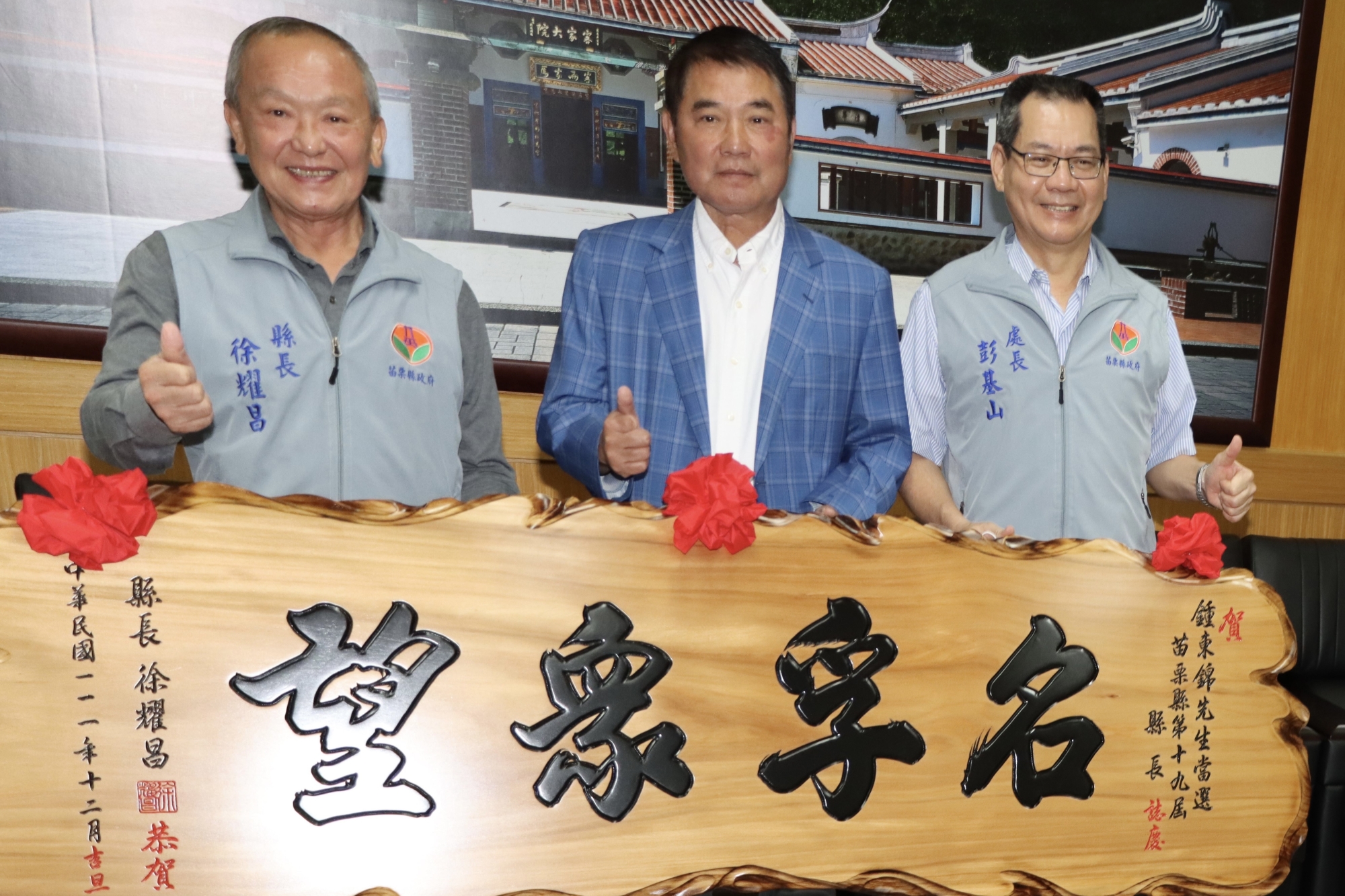 111年地方公職人員選舉圓滿落幕,苗栗縣長由現任議長鍾東錦高票當選。2日苗栗縣長徐耀昌頒贈「名孚眾望」牌匾予鍾東錦,期勉他上任後推動縣務工作遂心應手,帶領苗栗繁榮富強。