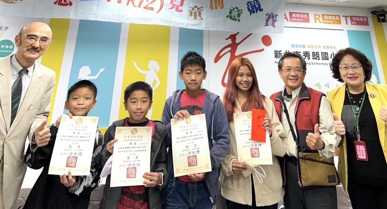 沙永傑理事長(左)和第一名隊伍合影右一是秀朗國小曾秀珠校長右三是張美婷指導老師 何致遠攝