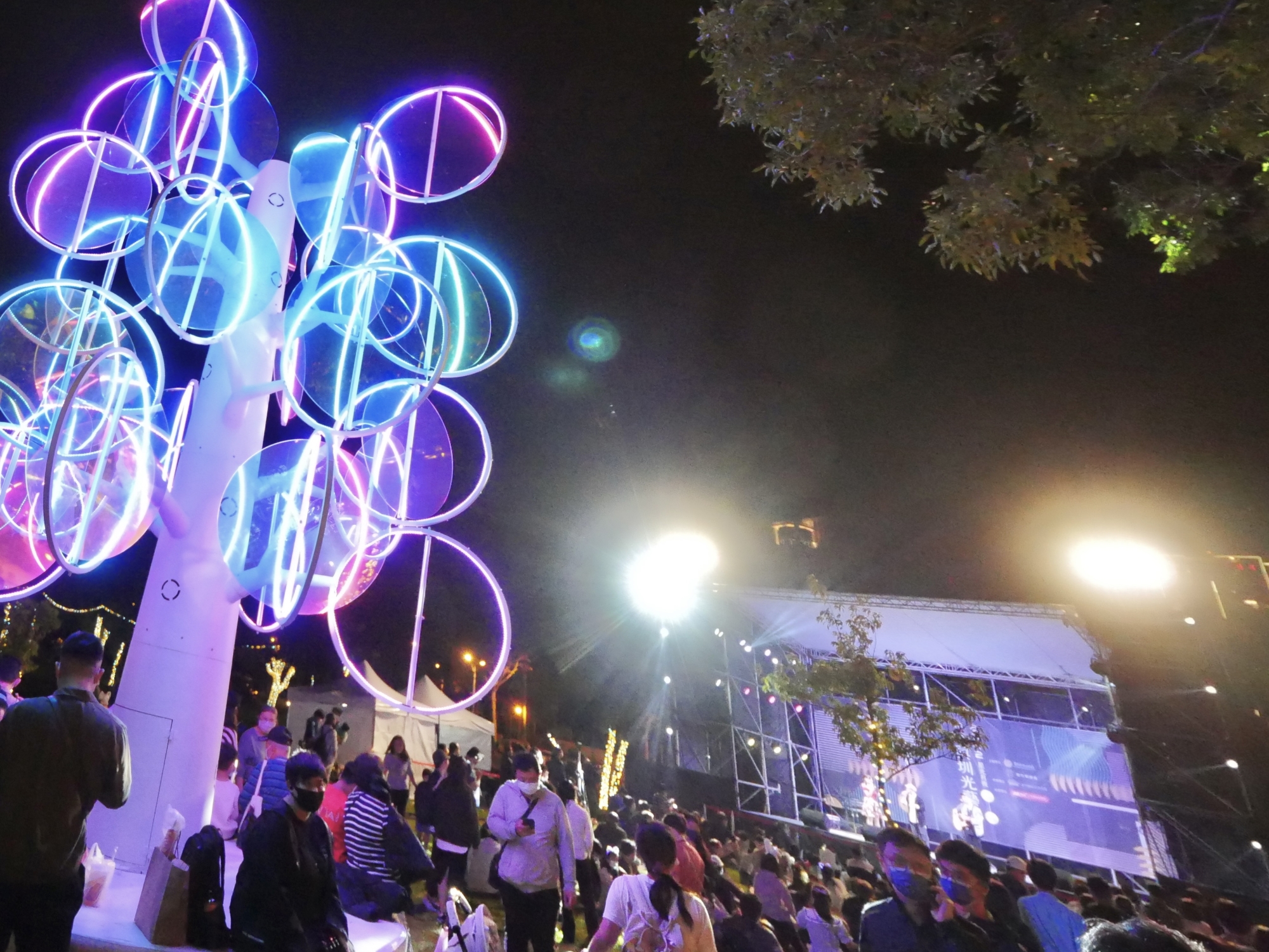 楊文科說,很高興今天看到人山人海的人潮來到東興圳遊玩,縣府團隊也相當感動,光藝節展期自即日至明年 1月20日農曆春節前,歡迎大小朋友明天繼續前來新竹縣最具特色的水岸公園享美食、賞燈景,漫步長達1.1公里的夢幻光環境,感受不一樣的星光月夜,也預祝大家新年及聖誕快樂。