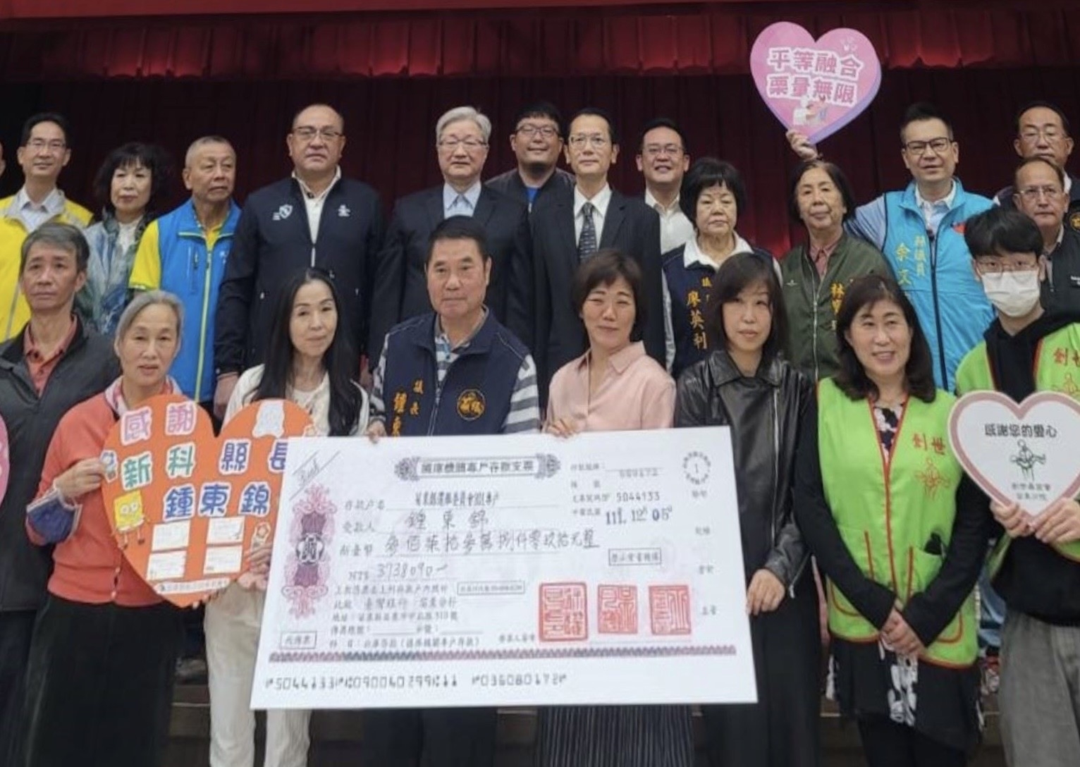 8日議長鍾東錦偕同妻子陳美琪捐贈選舉補助款,苗栗縣長徐耀昌偕同妻子蔡麗卿前往苗栗縣議會,見證議長鍾東錦善舉,除了31家身障機構和社團到場外,副議長李文斌、苗栗市民代表會副主席王封台及多位議員也到場感受溫暖與喜悅。