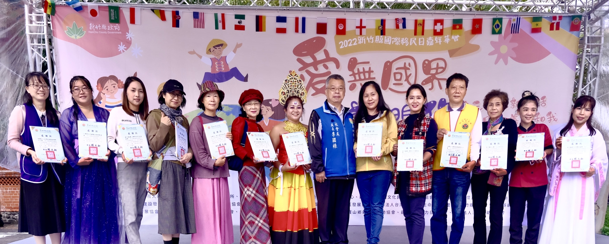 慶祝移民日,竹縣府今10日在新瓦屋客家文化保存區舉辦「2022新竹縣國際移民日嘉年華會」,來自各國新住民身穿來自家鄉傳統服飾,並帶來印尼迎賓舞、緬甸潑水節祝福舞等精彩表演及美食,現場異國風情滿滿,令人大開眼界。副縣長陳見賢也到場頒發13鄉鎮模範新住民家庭代表,其中黃銳清扶養身心障礙兒女長大、楊旭為尖石偏鄉行銷蔬果,獲得頒獎肯定。
