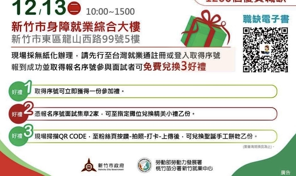 新竹就業中心胡伯堯主任表示,此次徵才活動共邀索爾思光電、勵威等30家科技、零售及餐飲業的知名廠商,釋逾1200個優質職缺,活動現場採無紙化辦理,並可免費兌換3好禮。