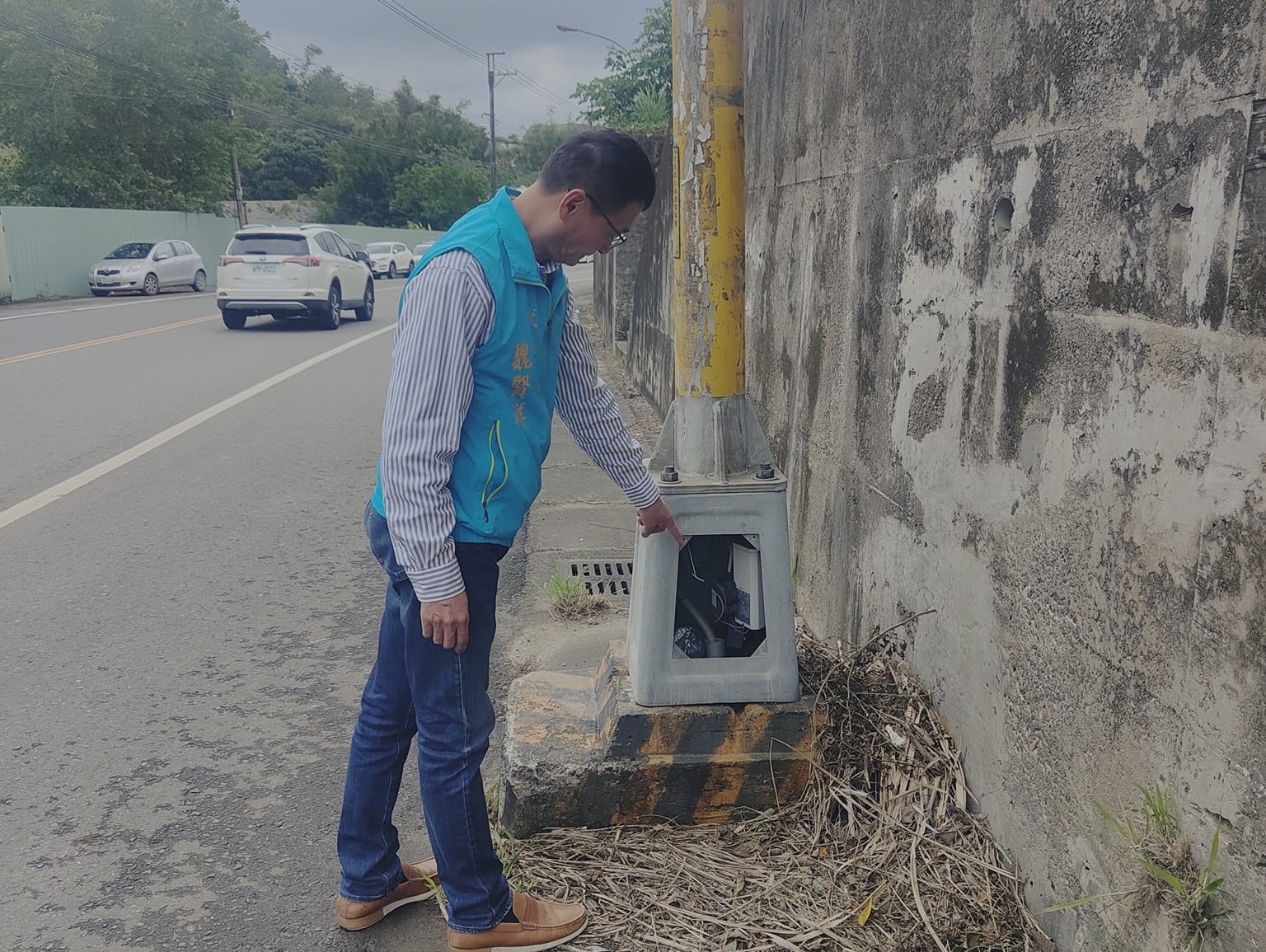 芎林鄉多處路燈基座蓋子不翼而飛,代表魏賢祥勘查後立即通報縣政府處理。(談曉泉攝)