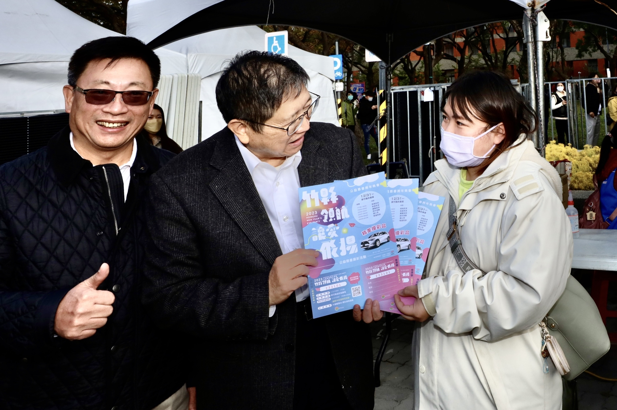 「竹縣領航,讓愛飛揚」2023公益慈善跨年晚會今晚31日於縣府前隆重登場,抽獎活動好禮滿滿,除Iphone手機、液晶電視、樂園門票等各種好康,最大獎為兩輛TOYOTA汽車,等待幸運兒開回家。摸彩券除了新竹縣之各家戶配發1張,還可用發票兌換,讓其他縣市的鄉親也能共襄盛舉,兌換時間至晚上7時止。縣長楊文科特別關心晚會彩排,邀請民眾共度歡樂跨年夜,祝福鄉親中大獎!