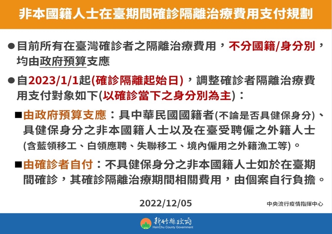 竹縣衛生局今3日指出,中央流行疫情指揮中心宣布自今年1月1日起,不具健保身分非本國籍人士,在臺期間如確診COVID-19,其隔離治療費用須由確診者自付。