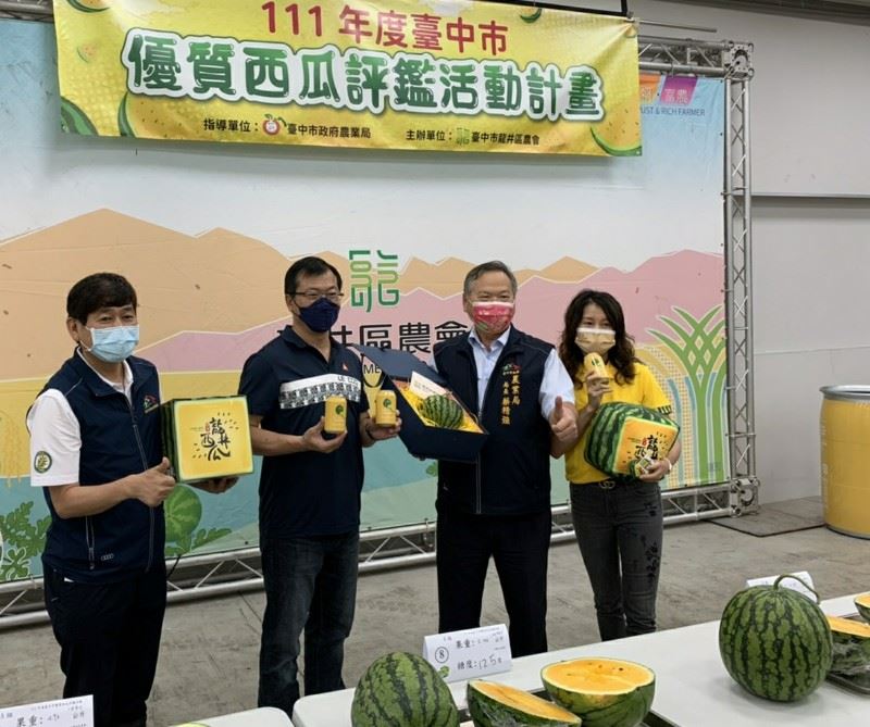 台中市政府農業局為推廣「吃在地、食當季」理念,讓消費者安心選購在地優質農特產品,提升台中西瓜栽培技術與果品品質,輔導龍井區農會於今(14)日舉辦「111年度台中市優質西瓜評鑑活動」,計有62組農友報名參賽,評鑑分為A組(龍井及海線地區為主)、B組(大肚及潭雅屯區為主),參賽品種為新蘭西瓜,邀請行政院農業委員會台中區農業改良場、台中市政府市政顧問及農友種苗股份有限公司等專家擔任評審,根據果重、糖度、外觀、肉色及風味口感等項目進行評鑑。