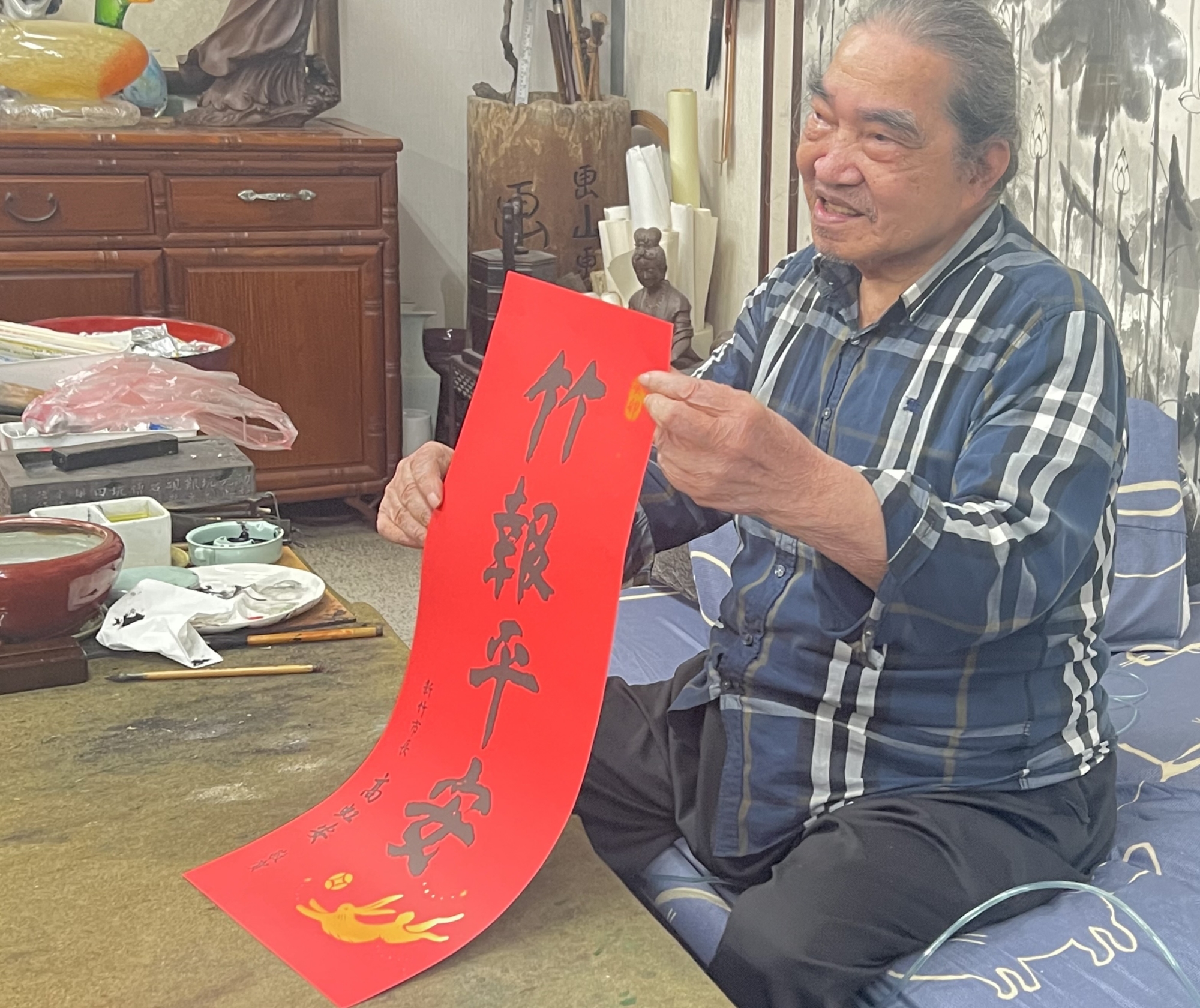 所以高虹安爽約,韓錦田非常能體諒,好似已經習慣政治人物分身乏術應對,依然開心著墨,寫了竹報平安4字春聯,還特別挑選金色,在春聯上用心畫了兔子行好運圖騰。