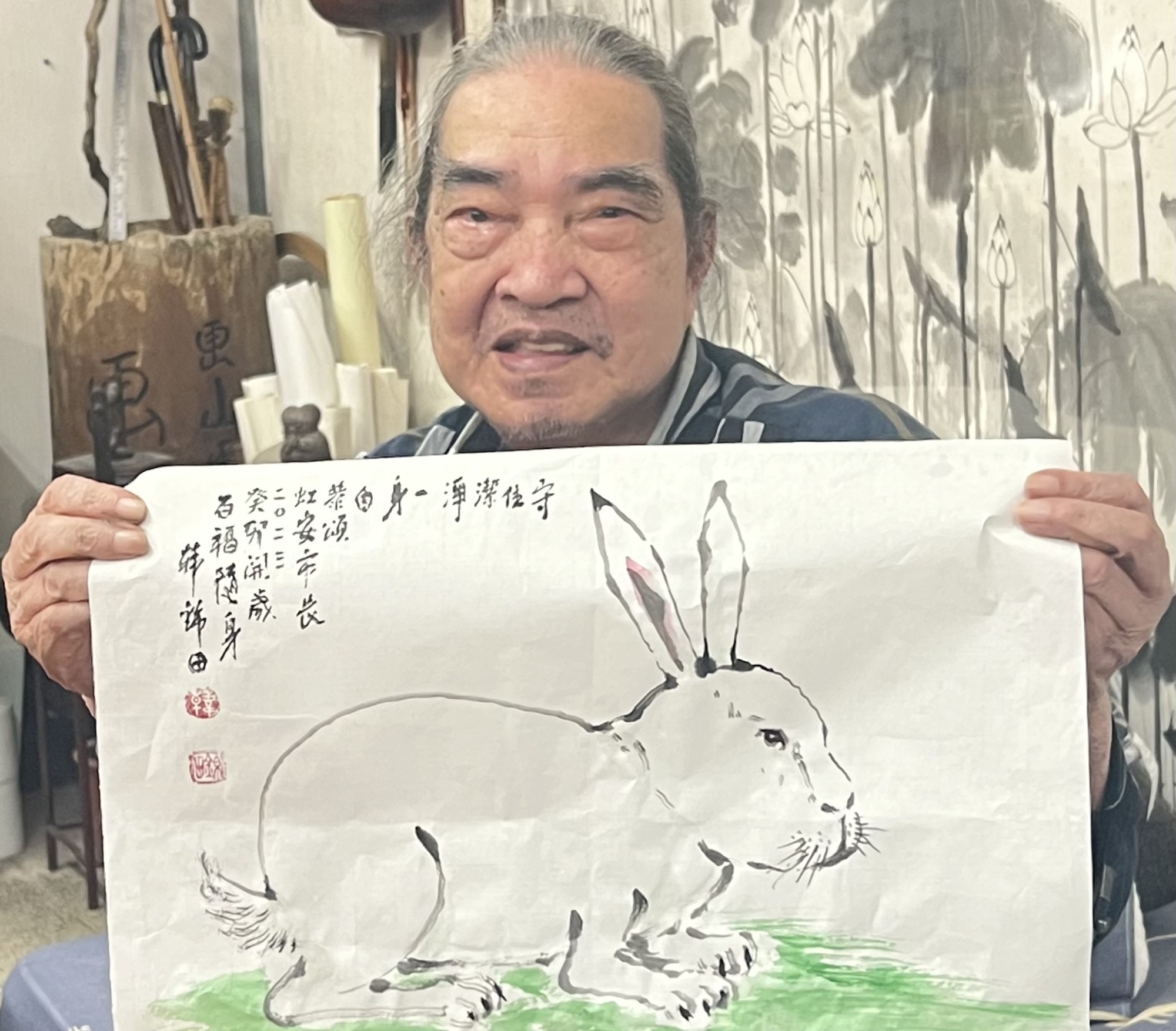 韓錦田還特別畫了一隻白兔贈送給高虹安,上面提字「守住潔淨一身白」,具有勸世警語含意,接著順筆恭頌虹安市長2023年百福隨身。