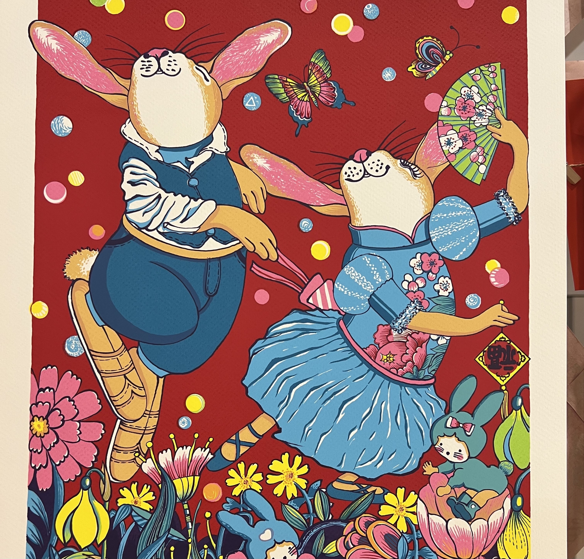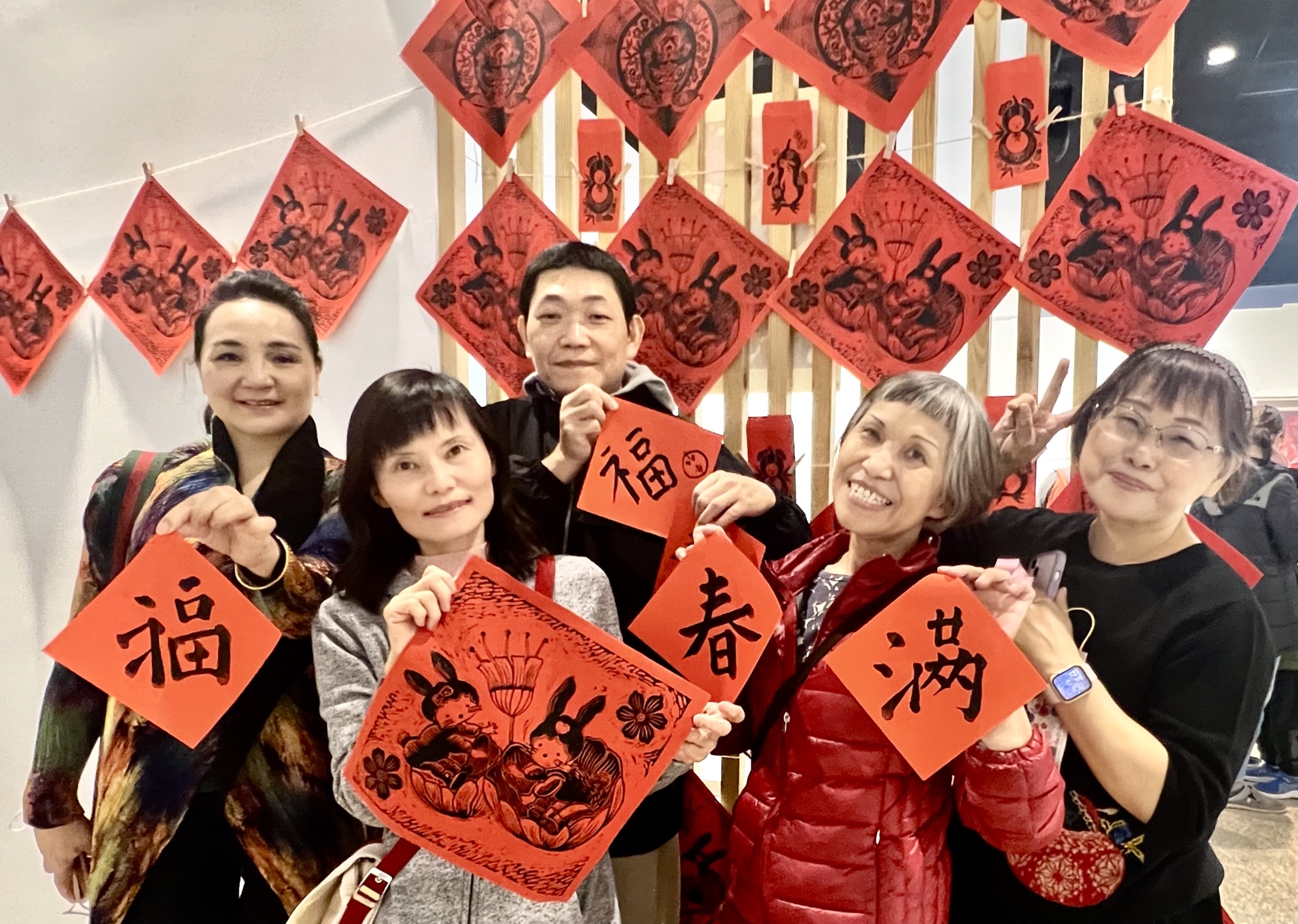 今15日下午14:00在美展會場,舉辦春節書寫版拓歡聚會,包含名家揮毫、創意春聯、版印年畫,民眾踴躍參與,會場一片熱鬧喜氣。先後參加年畫競賽,二度榮獲頭彩,得到今年全國版畫首獎的版畫家曾雪梅,在現場指導拓印各式方塊兔子春聯,吸引喜好民眾大排長龍體驗拓印成就感。