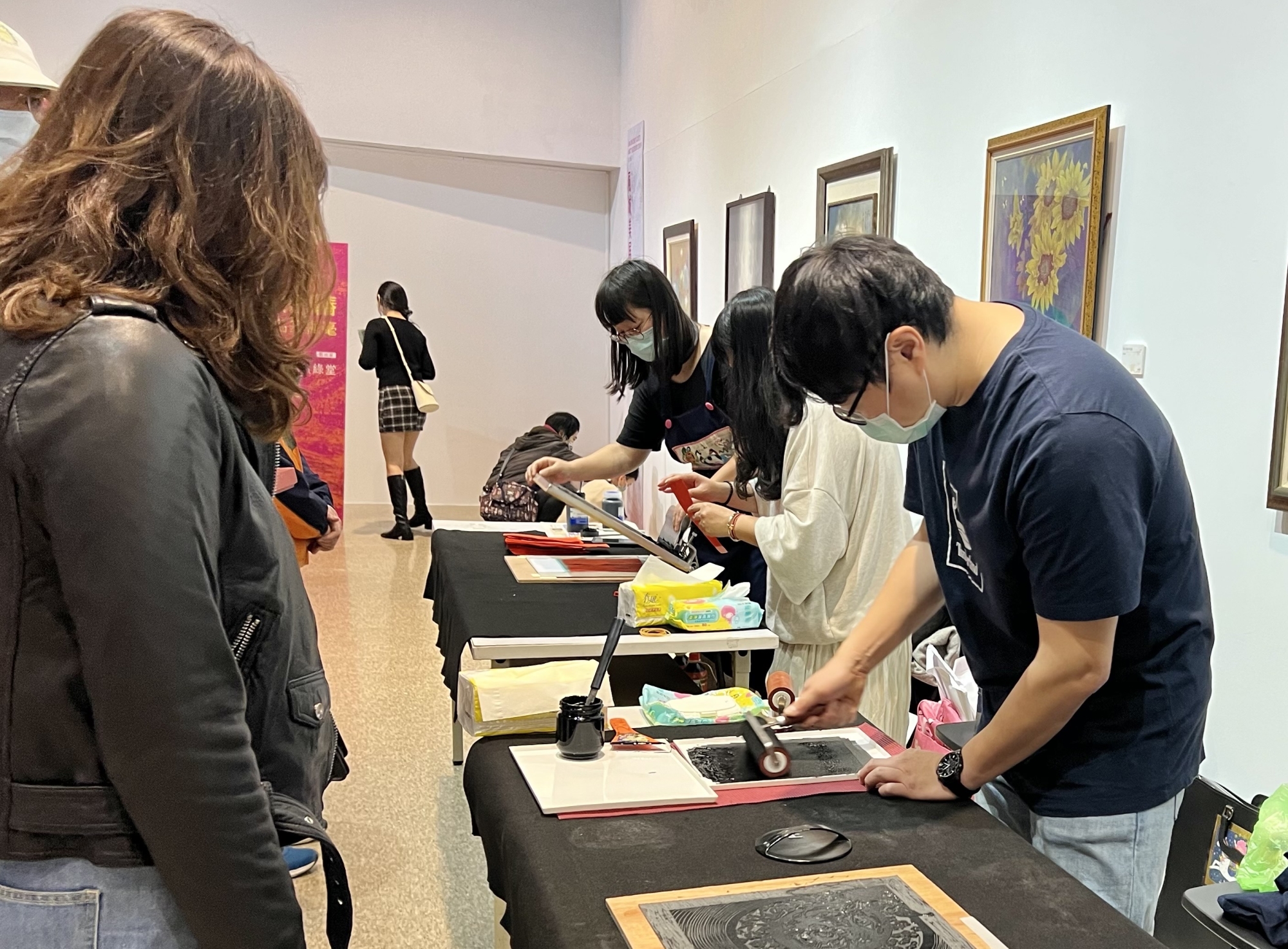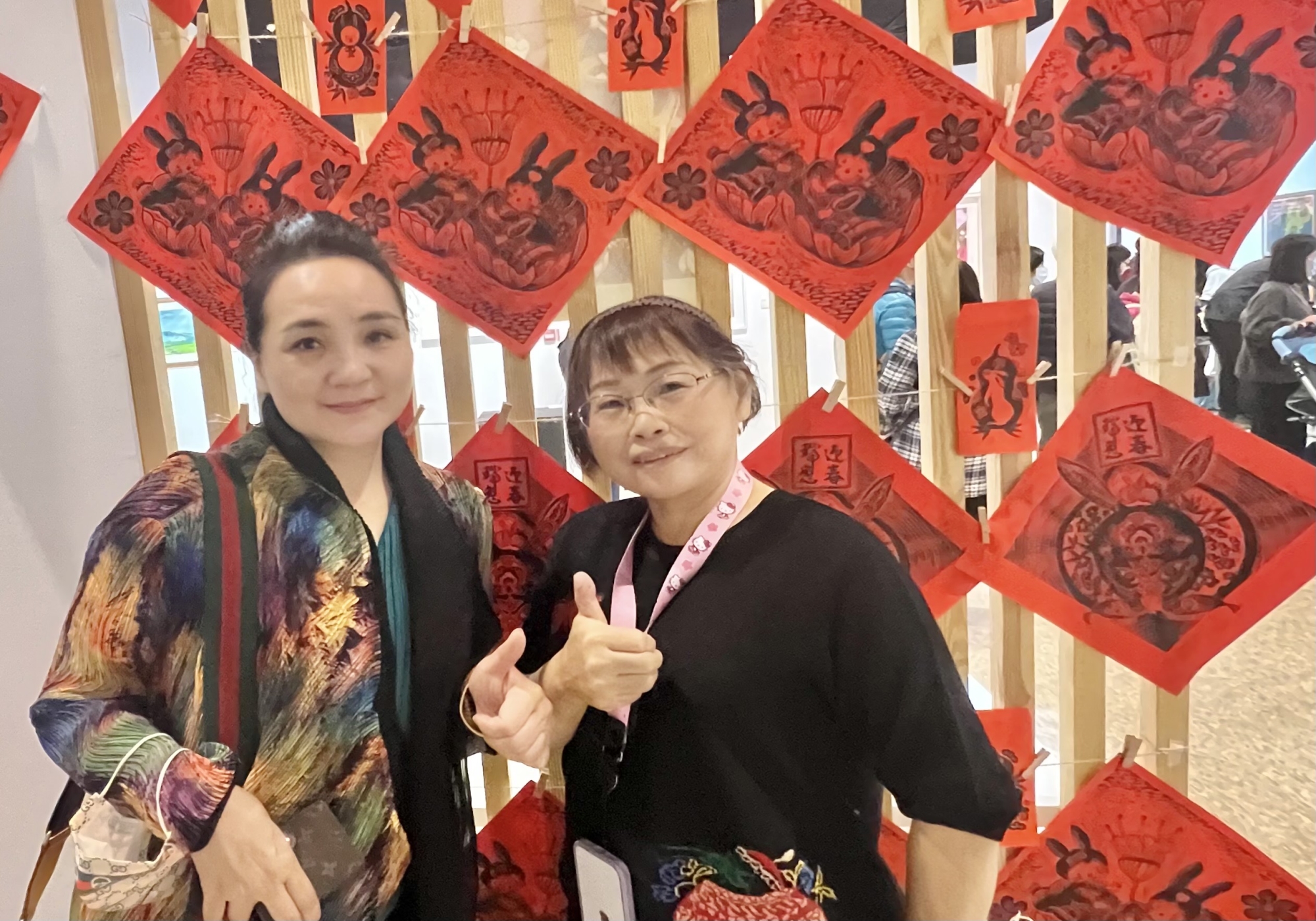 不僅版畫表現優異,曾雪梅製作拓印模子功夫同樣有獨到之處。新竹河畔畫會理事長膠彩畫家彭碧鈴,特別到場拜會曾雪梅,取經版畫和拓印技藝,分享曾雪梅老師指導大排長龍粉絲們,一一愉悅完成拓印春聯興奮氣氛。