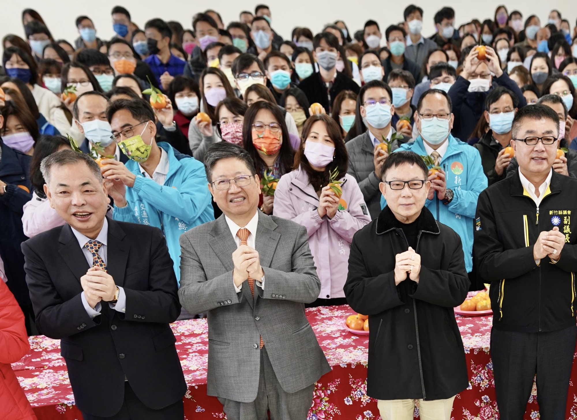 竹縣府新春團拜縣長楊文科(左二)、副縣長陳見賢(左一)、縣議會議長張鎮榮(右二)、副議長王炳漢(右一),與縣府團隊一起拜年。 何高祿攝