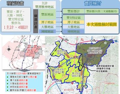 都發局說明,豐潭雅神地區為全市整體區域治理分區的豐原山城核心區,已於108年11月完成第一階段計畫整併,將五大都市計畫整併合為一個主要計畫。目前正進行第二階段整併後的都市計畫通盤檢討作業,從整體空間發展、地方產業需求及交通路網連結情形,進行土地使用、公共設施及交通系統的通盤檢討。