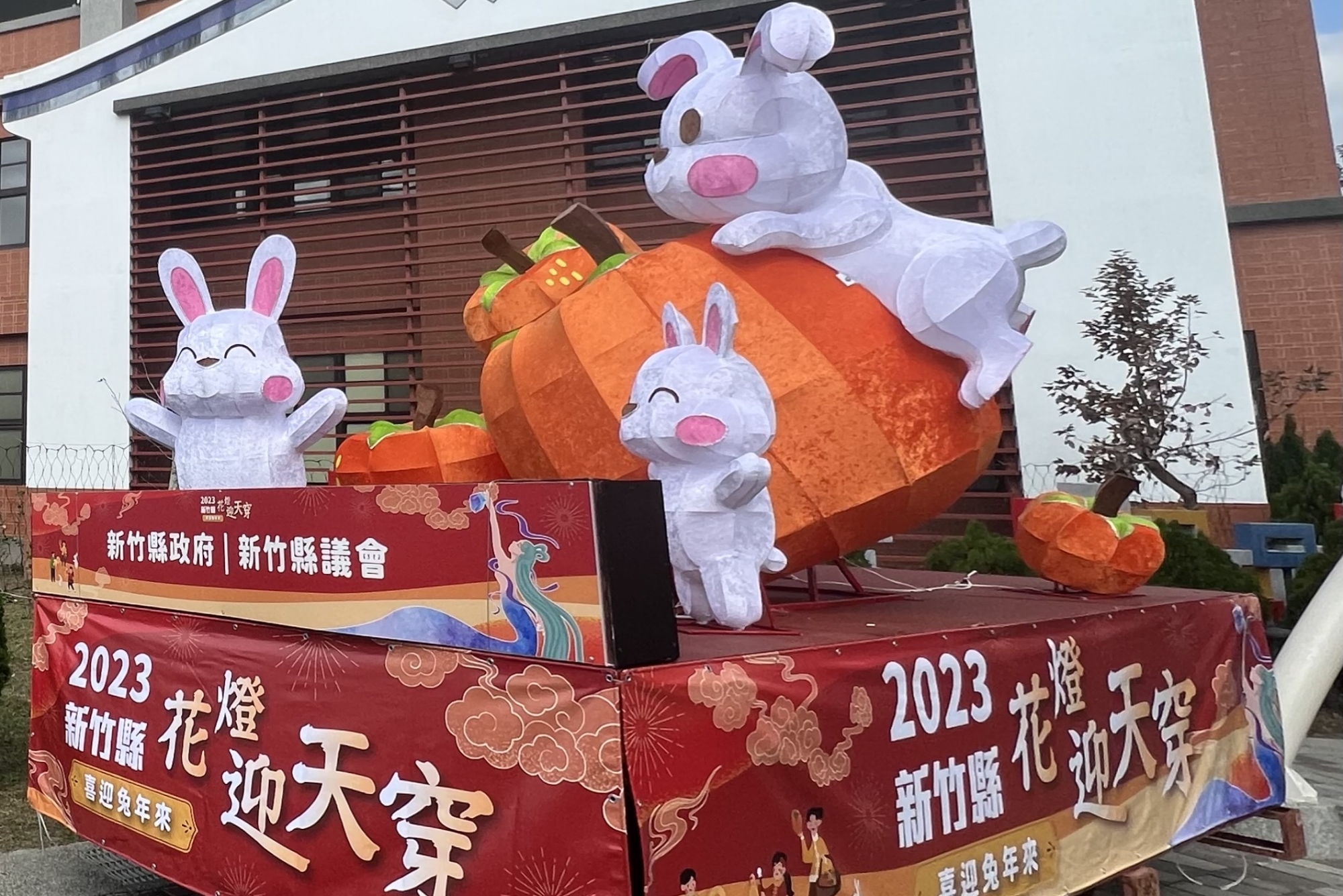 竹縣和議會有兩輛以三隻兔子組成的花車踩街 何致遠攝