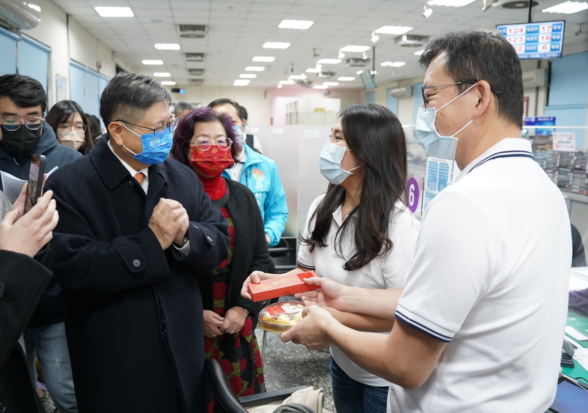 楊文科與夫人甘秀美今14日早現身竹北市戶政事務所,特地向今天西洋情人節辦理結婚登記的新人們送上溫暖祝福,也贈送結婚小禮物巧克力及金鏟子,祝福他們永浴愛河、早生貴子。