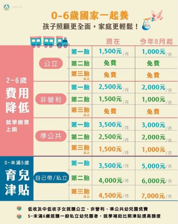 為因應少子女化現象,行政院於110年1月29日修正核定「我國少子女化對策計畫(110年至113年)」,對於6歲以下幼兒教育與照顧,以「平價教保續擴大」、「就學費用再降低」、「育兒津貼達加倍」為主軸,持續提升平價教保供給量、加碼幼托補助及育兒津貼,達到「增名額」、「減負擔」及「加津貼」的政策目標。