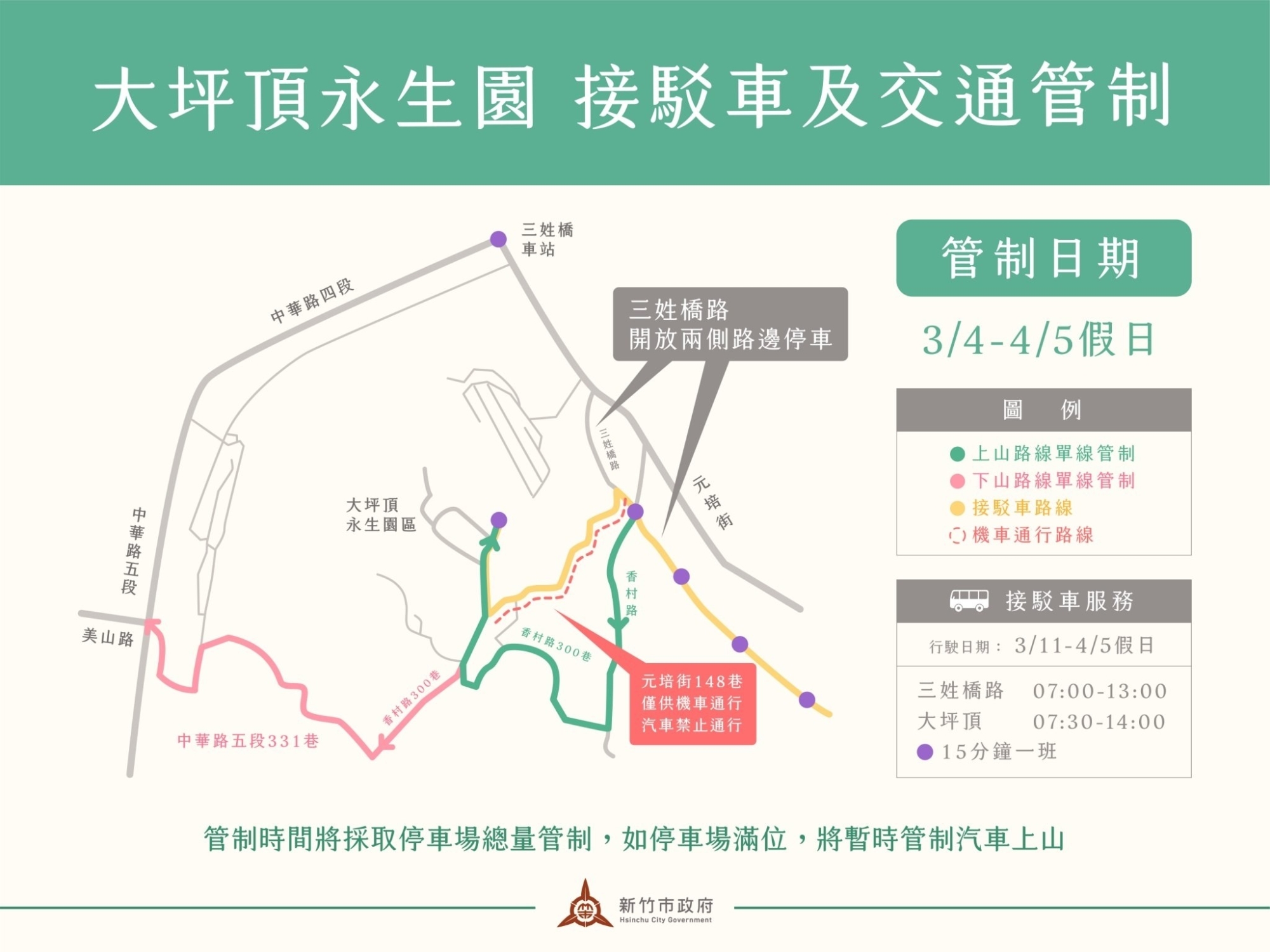 交通管制時間,三姓橋路兩側開放臨時停車,民眾可將車輛停放後搭乘定點接駁車,避免交通阻塞。另,也呼籲民眾提早掃墓,以避開人潮。