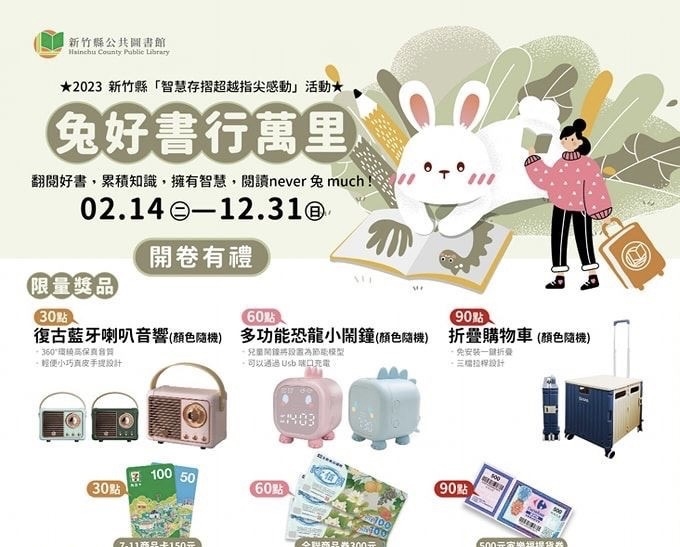 為鼓勵民眾在後疫情時代重返圖書館,竹縣文化局今年首次推出「兔好書行萬里之智慧存摺」,只要國中以上的愛書人,閱讀集點就能換到藍牙喇叭等限量好禮,或換摸彩券抽氣炸鍋、腳踏車等大獎。針對兒童閱讀部分,也精選童書故事,推出「小圖妹妹說故事」Podcast節目,讓親子一起線上討論收看。