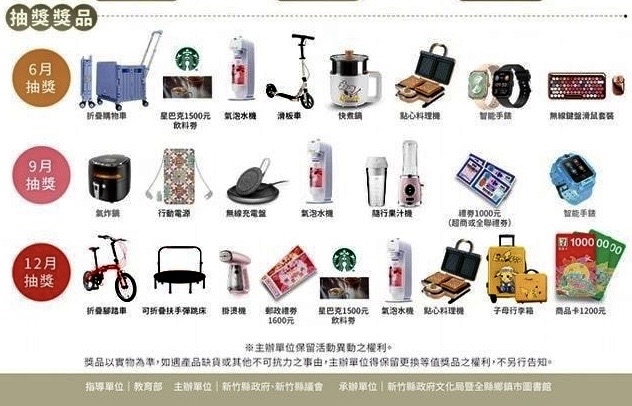 竹縣文化局說明,本次存摺閱讀集點活動參加對象為國中生以上(含)的愛書人,可到新竹縣文化局圖書館及13鄉鎮市立圖書館領取閱讀存摺,在任一館每次借閱6冊以上館藏書籍(不包含視聽資料)當日可集1點(每日每館可各集1枚為限), 每次全程參與新竹縣公共圖書館活動(不包含爹地媽咪說故事),可集2點,集到的點數可兌換獎品或抽獎券。