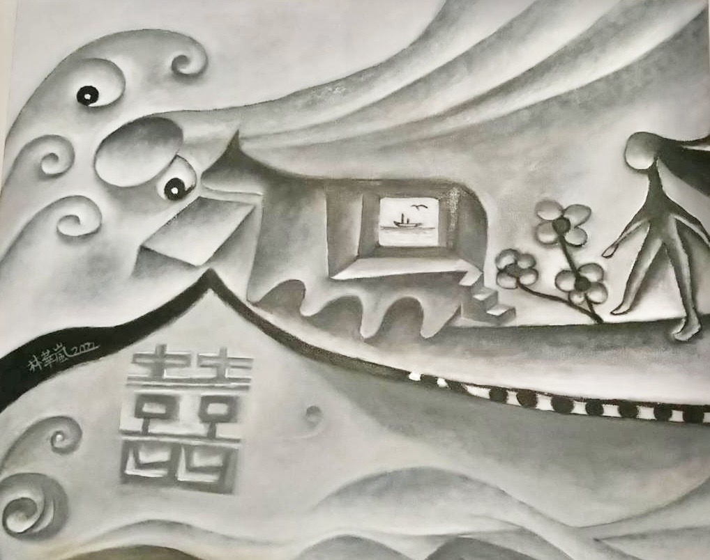 澎湖東砲台放羊女,沒擔心可怕的狼,不過澎湖風也夠嗆,經常要留意免得羊入風口,吹掉海裡給鯊魚加菜。放羊女林華嵐憶兒時,技巧的彩繪手拿著天人菊,由砲窗口望著遠處大船,幻想白雪公主和王子步入禮堂喜悅,無憂無慮與羊群成長世界,流露畢卡索風格的菊島放羊女孩。