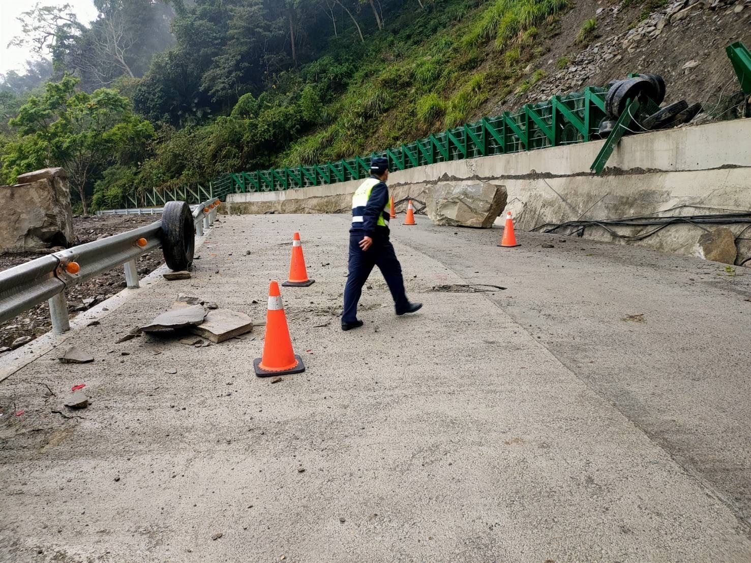 頭份分局警方呼籲:目前該道路因天氣多變化,常有落石,請用路人行經該路段小心通行,以確保人車安全。