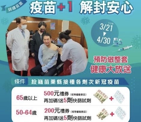 為響應中央推出的「疫苗加一,解封安心」政策,鼓勵民眾施打新冠疫苗追加劑,鍾東錦縣長宣布,4月底前50歲以上設籍苗栗縣縣民,於苗縣合約醫療院所或社區接種站施打任何一劑新冠疫苗,50至64歲者可領取200元禮券,65歲以上可獲500元禮劵,加碼5劑快篩。