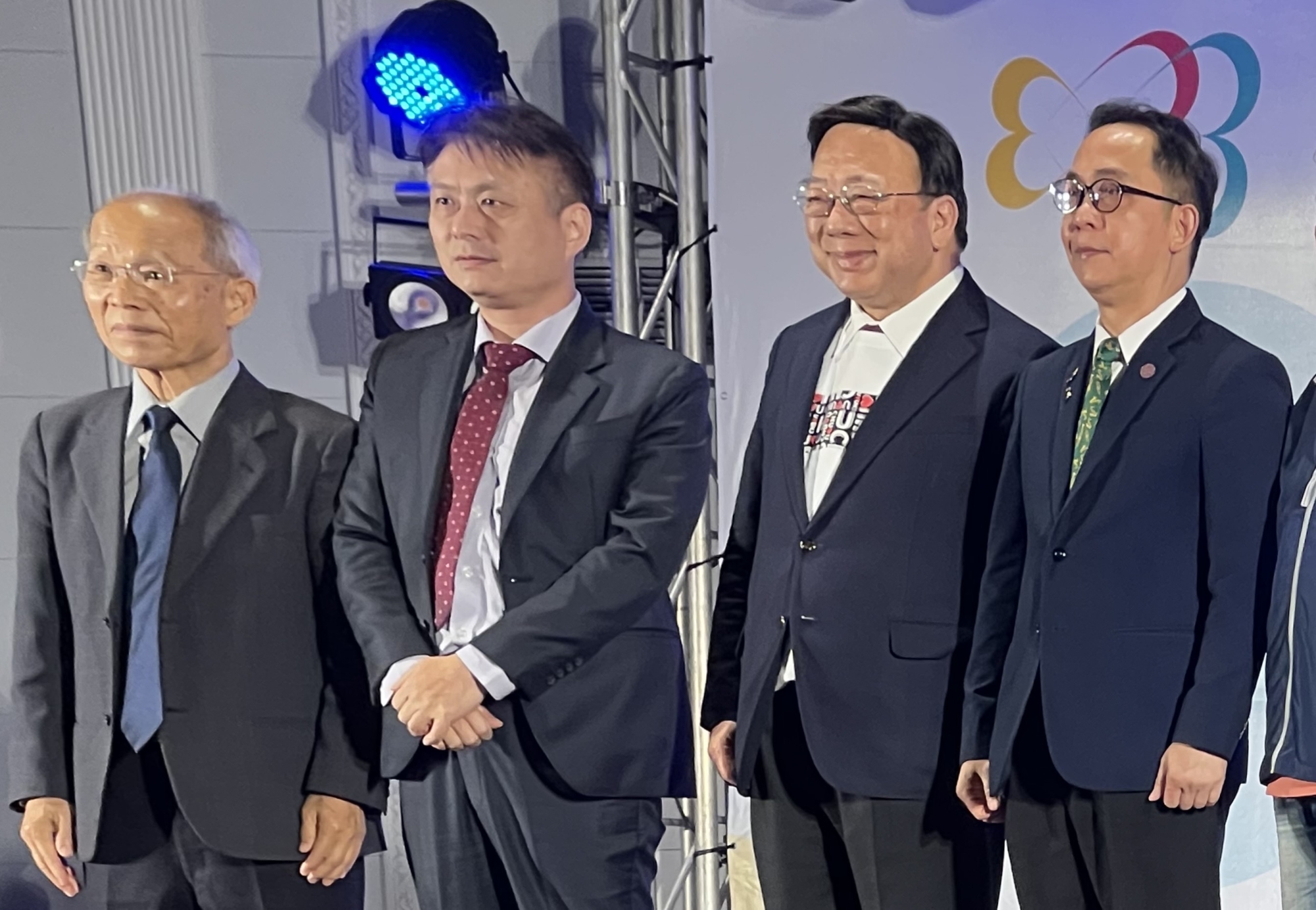 (左起)創辦人林政則、董事長楊勝翔、校長劉維祺和校友會長莊明熙歡迎校友回娘家。 何高祿攝